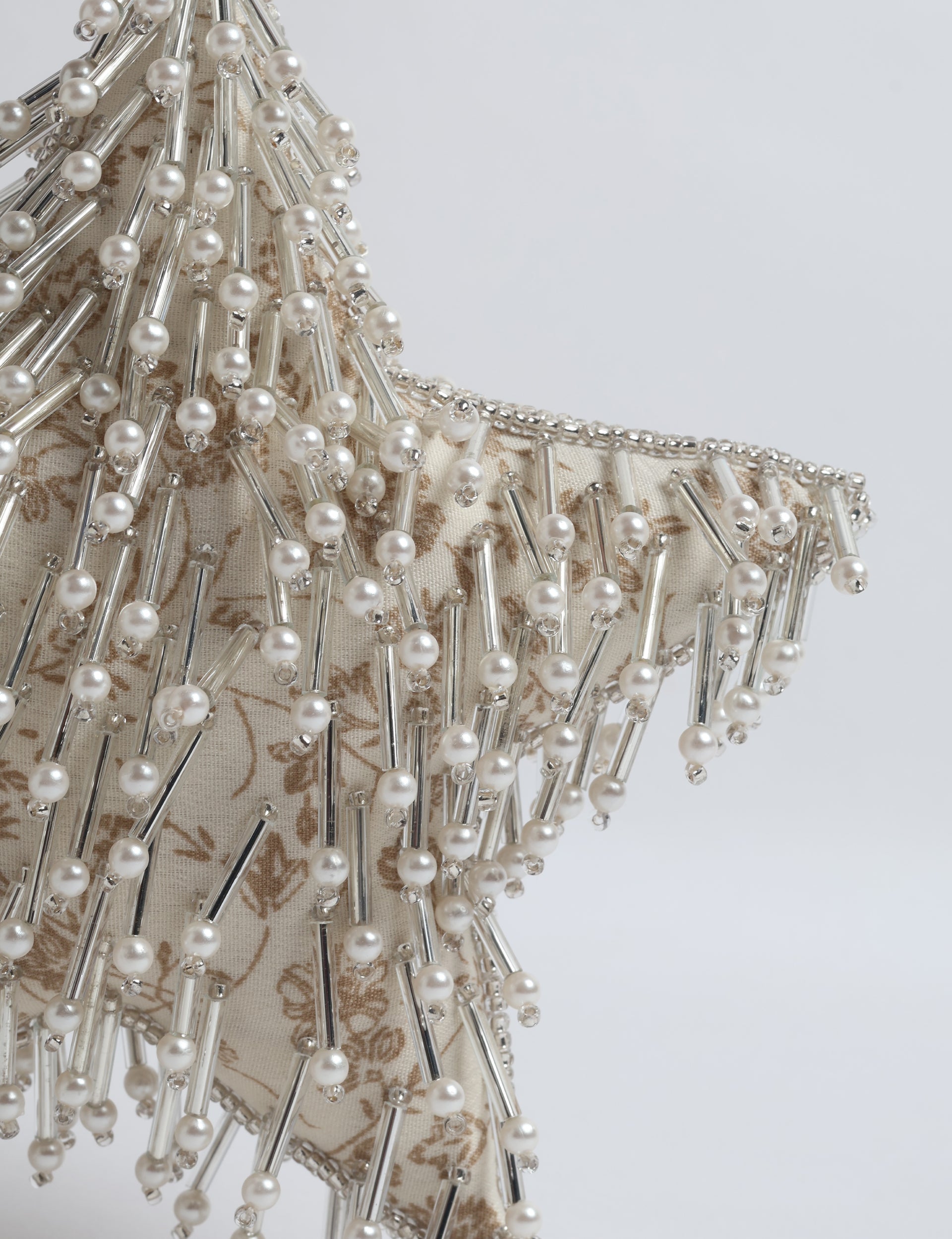 The Precious silver star ornament is a larger sized ornament in carefully curated palette of ivory and grey preloved saris, filled with organic cotton and adorned with exquisite silver hand embroidered embellishments of stones, sequins, pearls and glass beads. Lighting and screens may cause slight variations in color appearance.