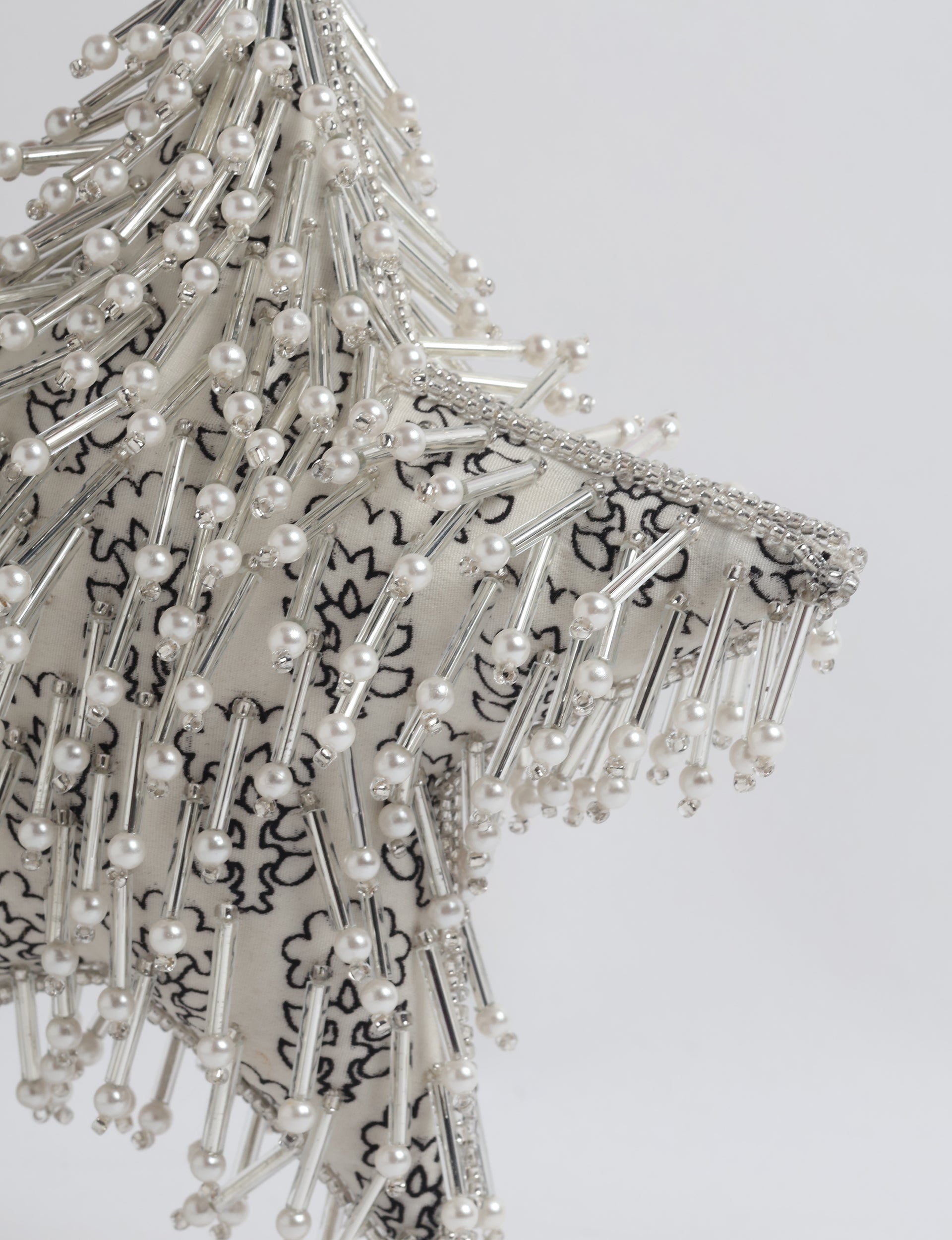 The Precious silver star ornament is a larger sized ornament in carefully curated palette of ivory and grey preloved saris, filled with organic cotton and adorned with exquisite silver hand embroidered embellishments of stones, sequins, pearls and glass beads. Lighting and screens may cause slight variations in color appearance.