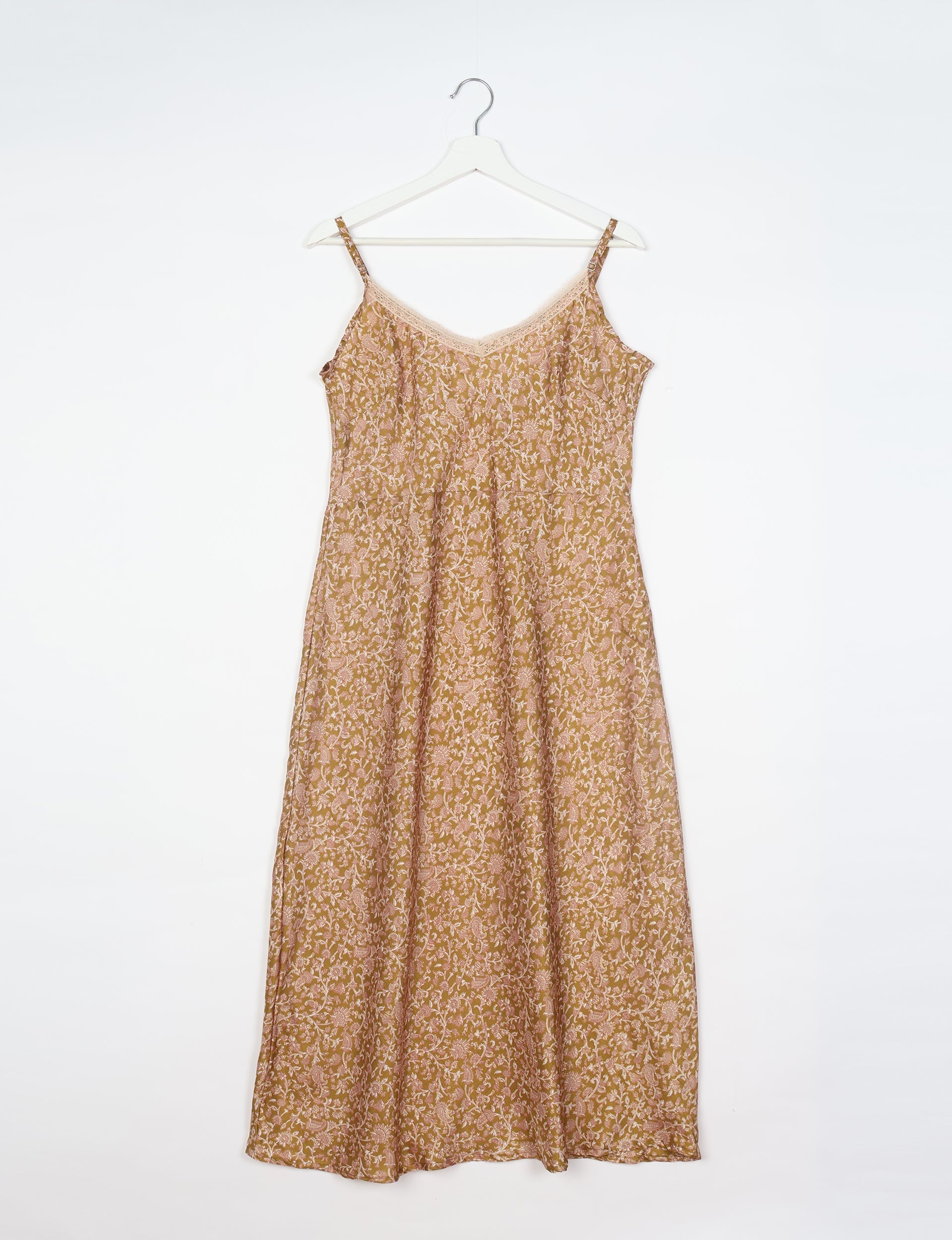 Este vestido lencero de largo midi tiene una silueta en forma de A y tirantes finos ajustables. El escote tiene una suave forma de V en la parte delantera y detalles de encaje. La iluminación y las pantallas pueden causar ligeras variaciones en el color.
