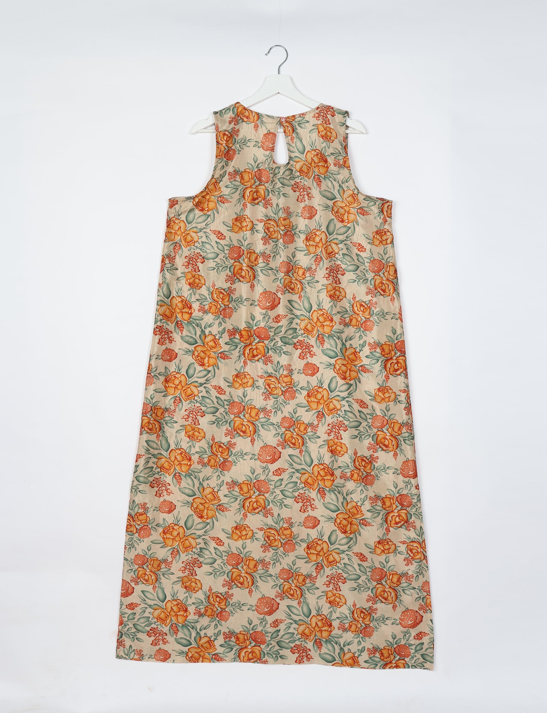 Robe longue sans manches, de coupe trapèze, dotée d'un décolleté rond et d'une silhouette longue qui s'évase progressivement des épaules jusqu'à l'ourlet. Elle comprend une ouverture en forme de trou de serrure à l'arrière du décolleté, fermée par une boucle et un bouton.