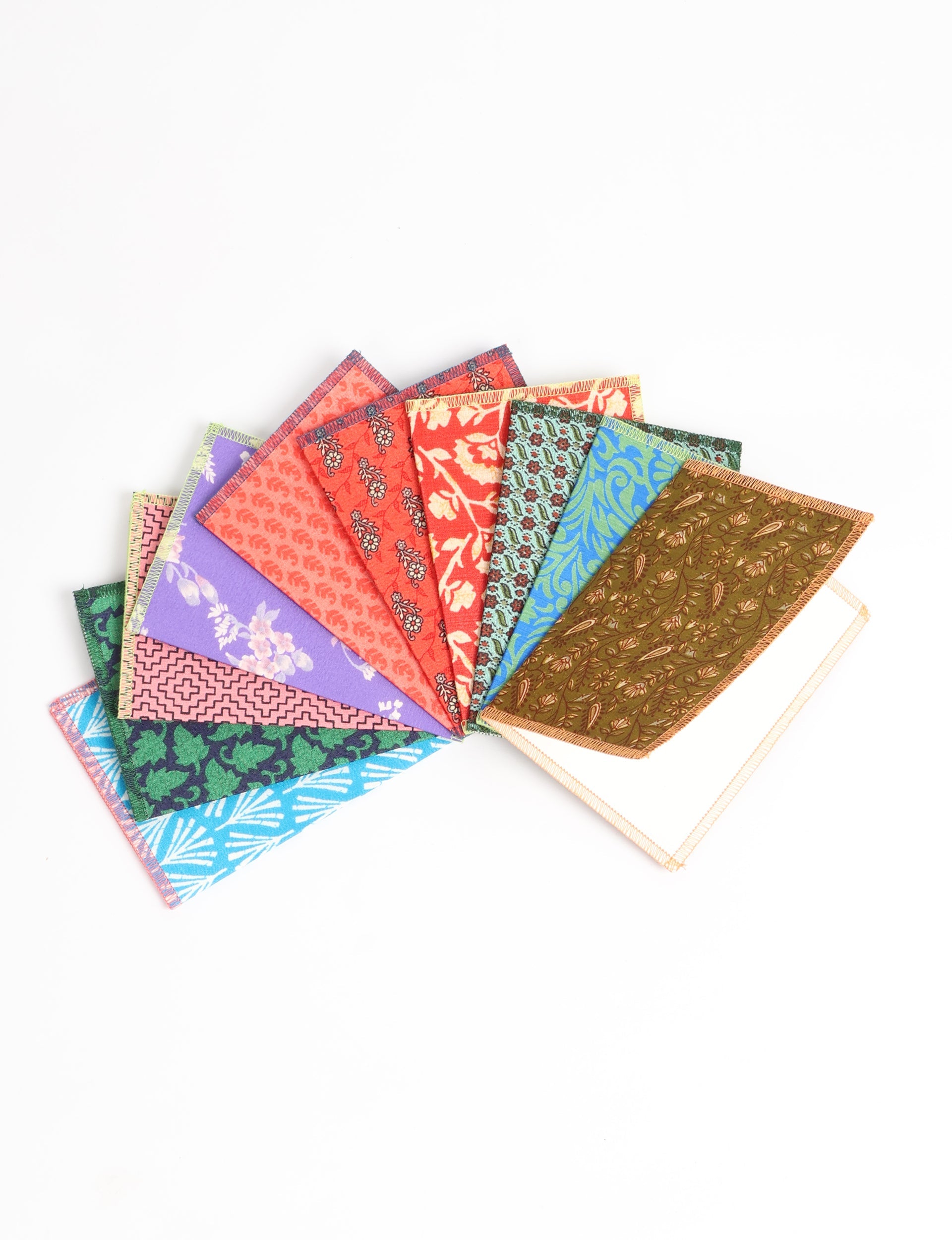 Fabriqué à partir de papier 100 % recyclé, cet assortiment de cartes postales pliées est réalisé à partir de tissu sari imprimé et présente des bords surjetés à motifs. Livrées avec des enveloppes.