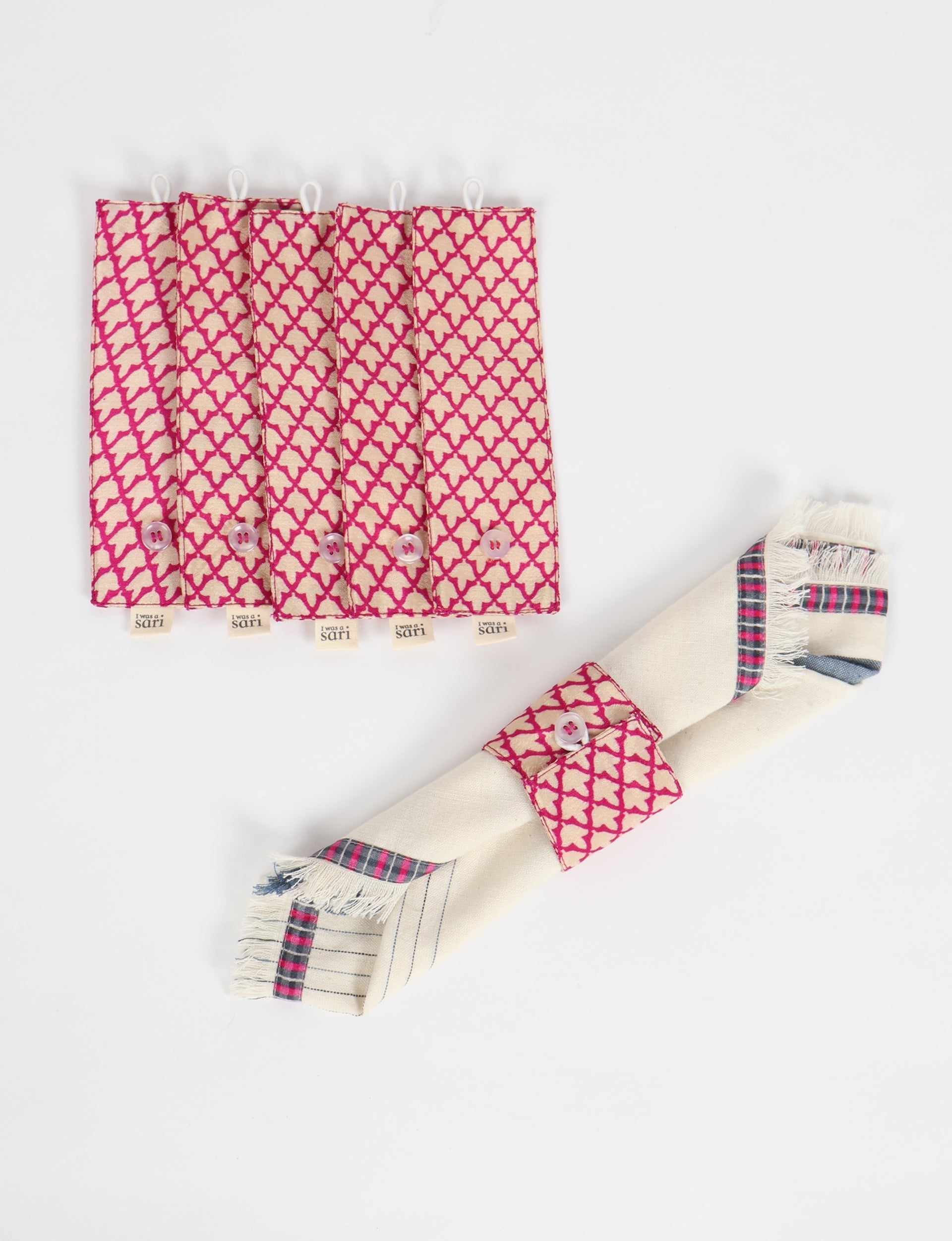 Lot de six ronds de serviette en tissu avec fermeture à bouton et élastique. Permet de maintenir les serviettes bien en place