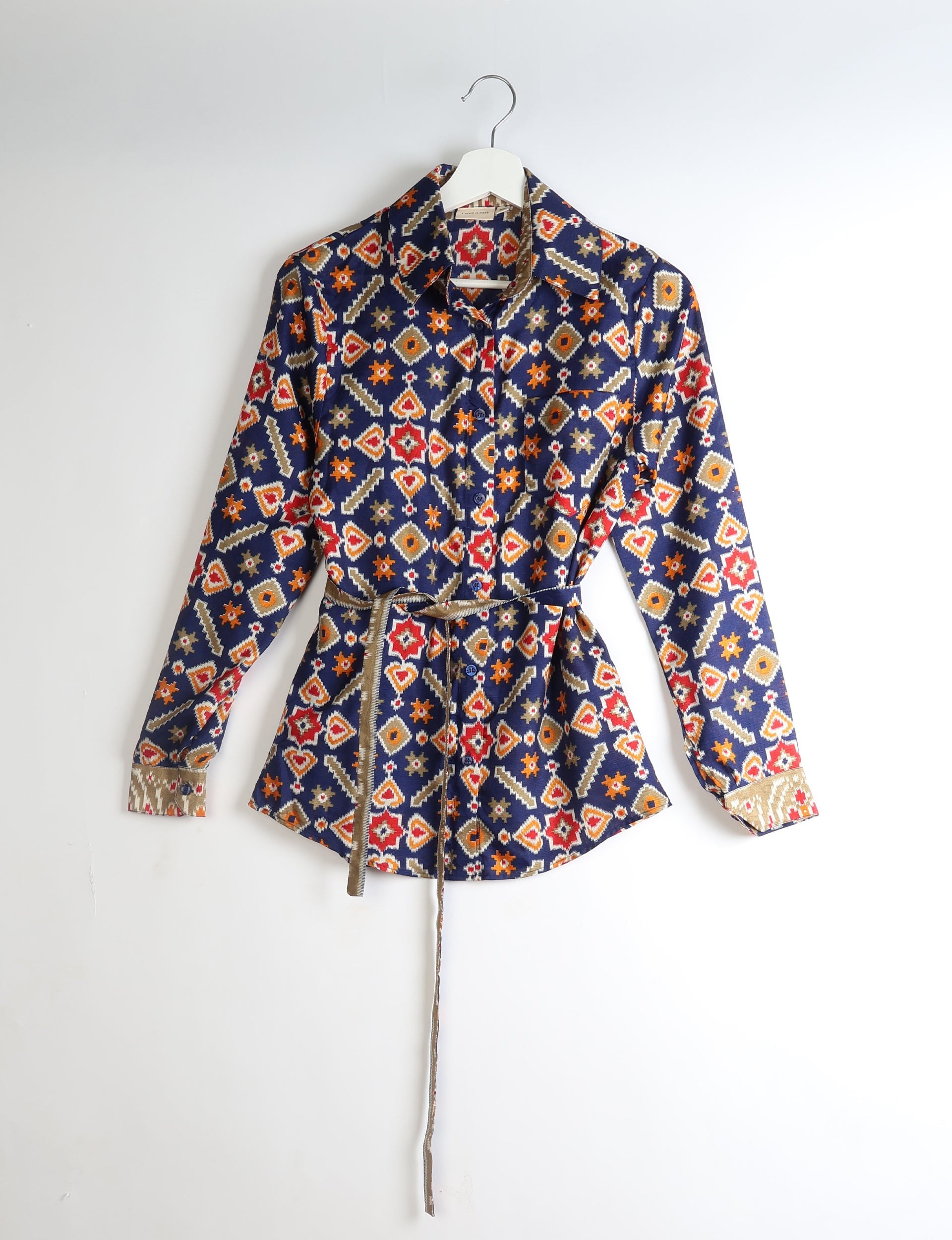 Chemise ajustée à manches longues, avec col semi-italien, boutonnage sur le devant et poche avant. Elle est dotée de poignets standard avec boutons. La chemise comprend une ceinture amovible dans le même tissu, qui peut être portée à la taille ou autour du cou comme une cravate.