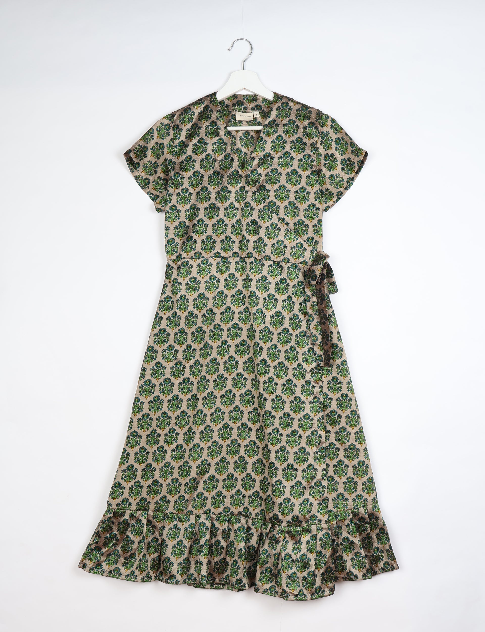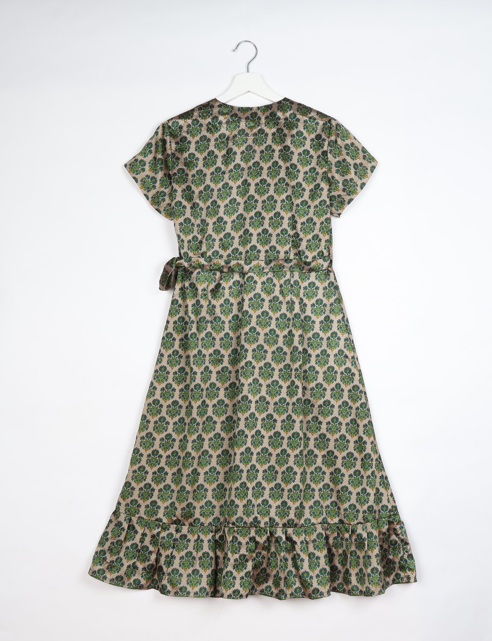 Cette robe portefeuille mi-longue est dotée de manches courtes. Le corsage est drapé sur le côté et se noue à l'extérieur par une ceinture du même tissu. La jupe s'évase en une coupe trapèze. L'ourlet est orné d'un volant froncé qui ajoute volume et mouvement. L'éclairage et les écrans peuvent entraîner de légères variations de couleur.