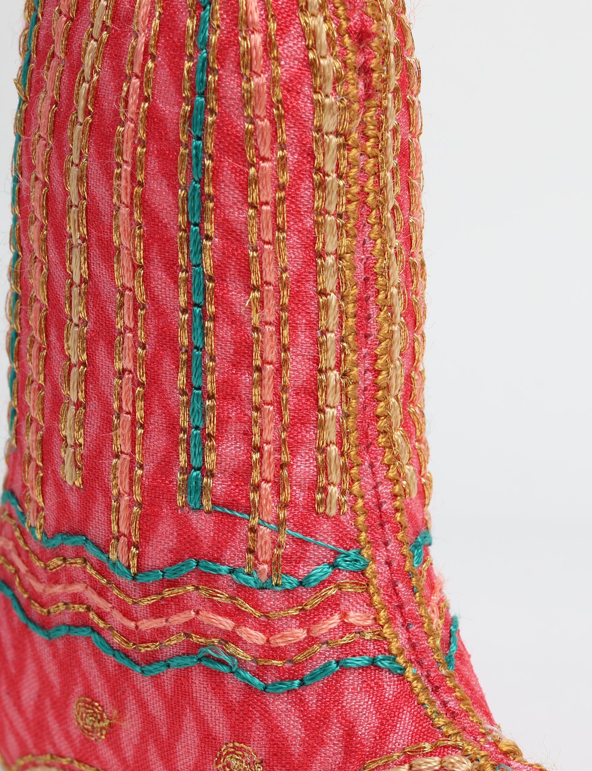 The bell-shaped festive decoration is made from preloved saris and filled with organic cotton filling. Embroidered with vibrant silk and metallic gold thread and hand finished. Lighting and screens may cause slight variations in color appearance.
