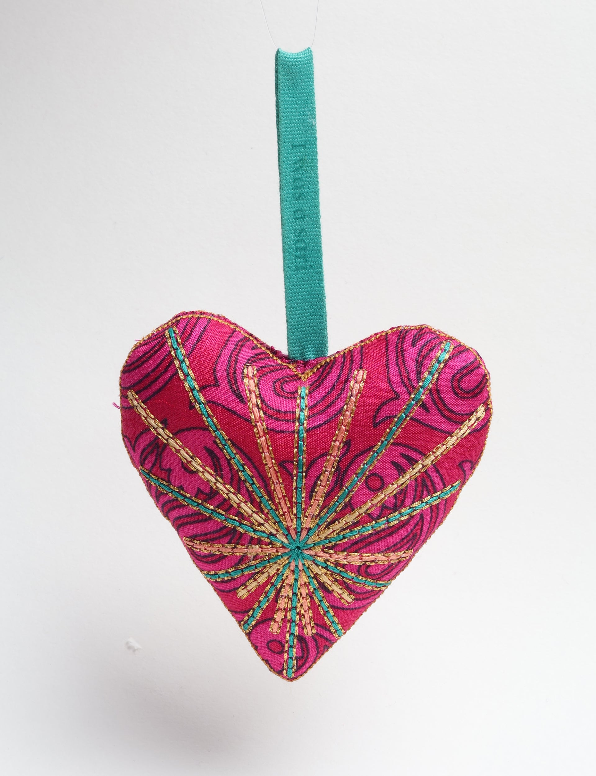 La décoration en forme de cœur est fabriquée à partir de saris d'occasion et remplie de coton biologique. Elle est brodée de soie aux couleurs vives et de fil métallique doré, puis finie à la main.