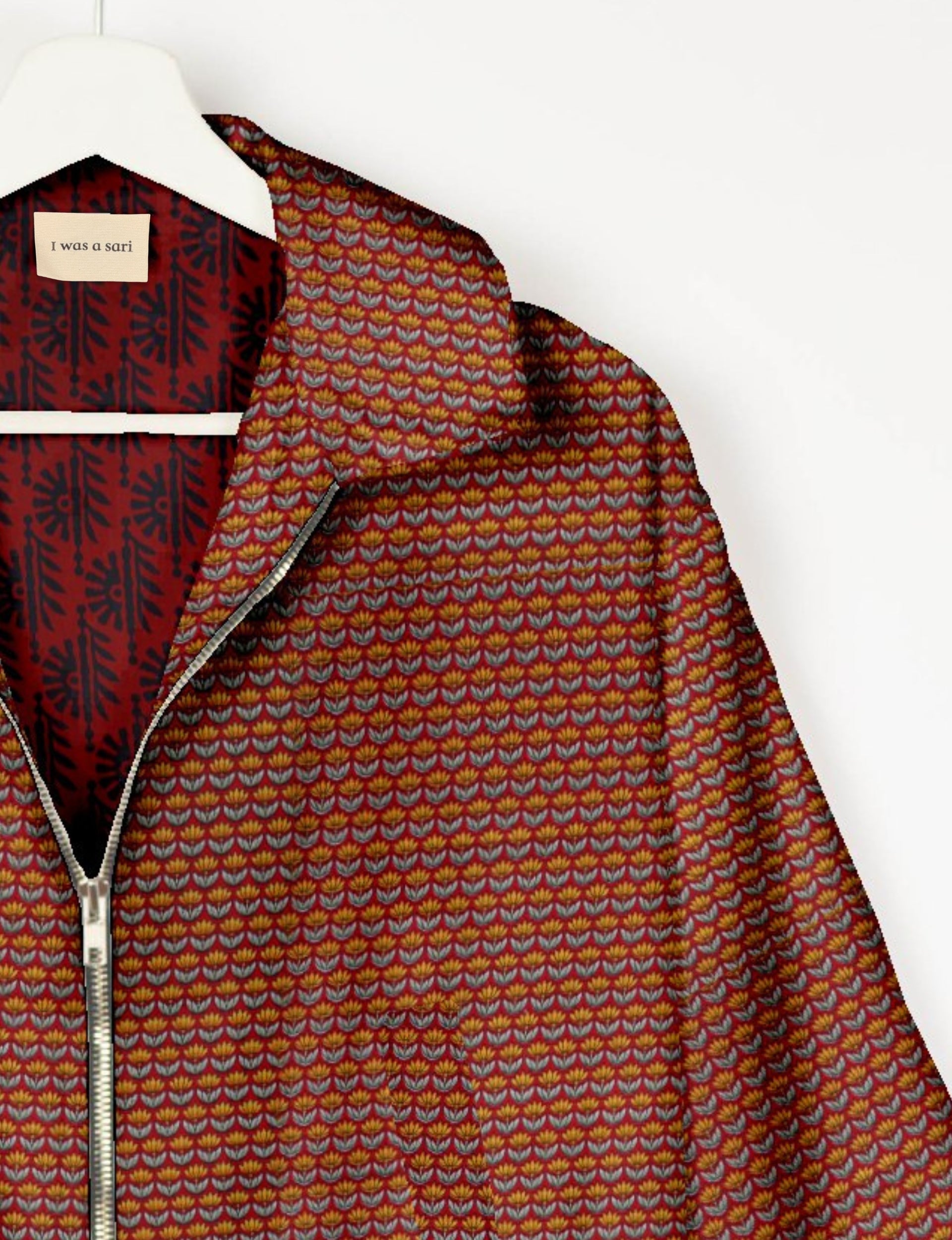 avec un bas, un ourlet et des poignets élastiqués. Il est doté de deux poches passepoilées et de deux fermetures éclair métalliques sur le devant. Il est également doté d'une doublure imprimée sari et d'un col rabattu. Il est parfait pour les journées printanières, les soirées fraîches ou les espaces de travail climatisés, sans vous alourdir.
