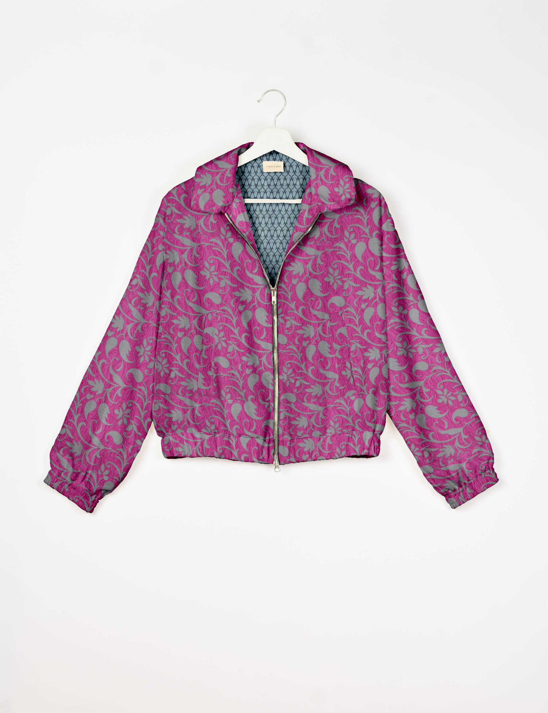 avec un bas, un ourlet et des poignets élastiqués. Il est doté de deux poches passepoilées et de deux fermetures éclair métalliques sur le devant. Il est également doté d'une doublure imprimée sari et d'un col rabattu. Il est parfait pour les journées printanières, les soirées fraîches ou les espaces de travail climatisés, sans vous alourdir.