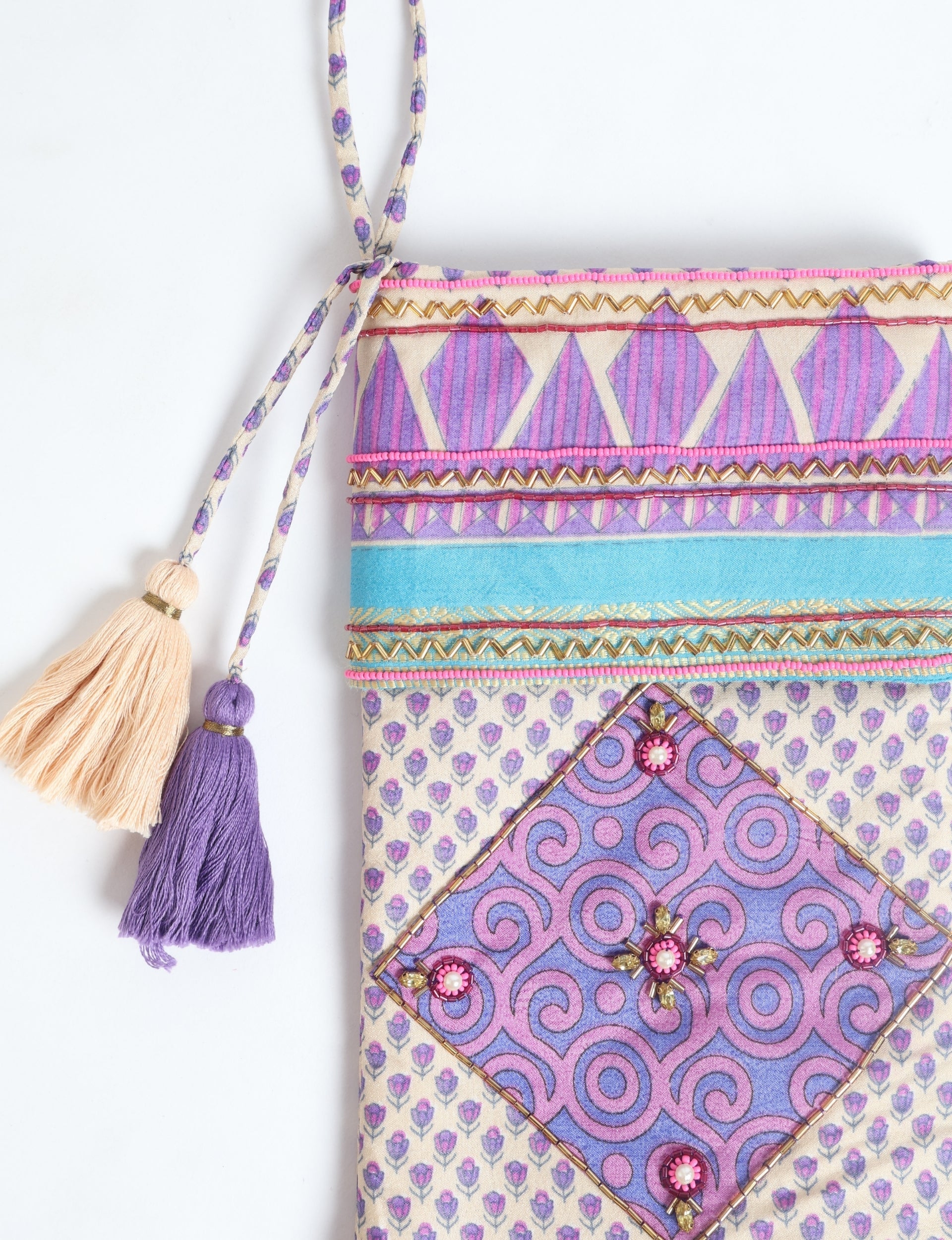 The Cheer Christmas stocking is crafted from a vibrant palette of preloved saris with patchwork detailing, exquisite hand embroidered embellishments of stones, sequins, pearls and glass beads and a delicate heart charm ornament with thread tassel. Lighting and screens may cause slight variations in color appearance.