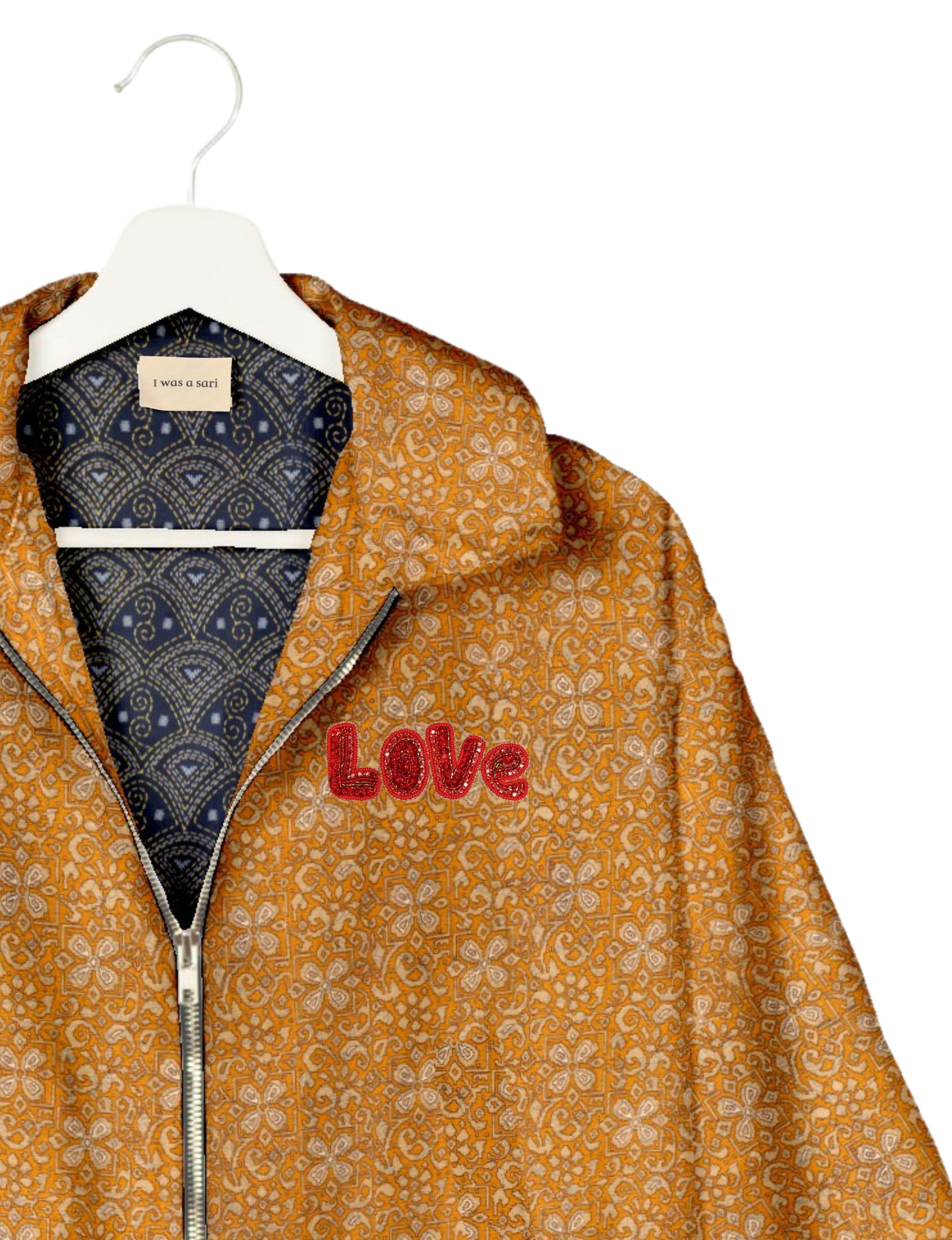 A special edition of the Classic Bomber , elevated with intricate handcrafted Aari embroidery that spells out "Love". And by our female artisans no less. Crafted from upcycled saris, this jacket is more than just a statement piece—it's a wearable story of artistry, tradition, and conscious living.