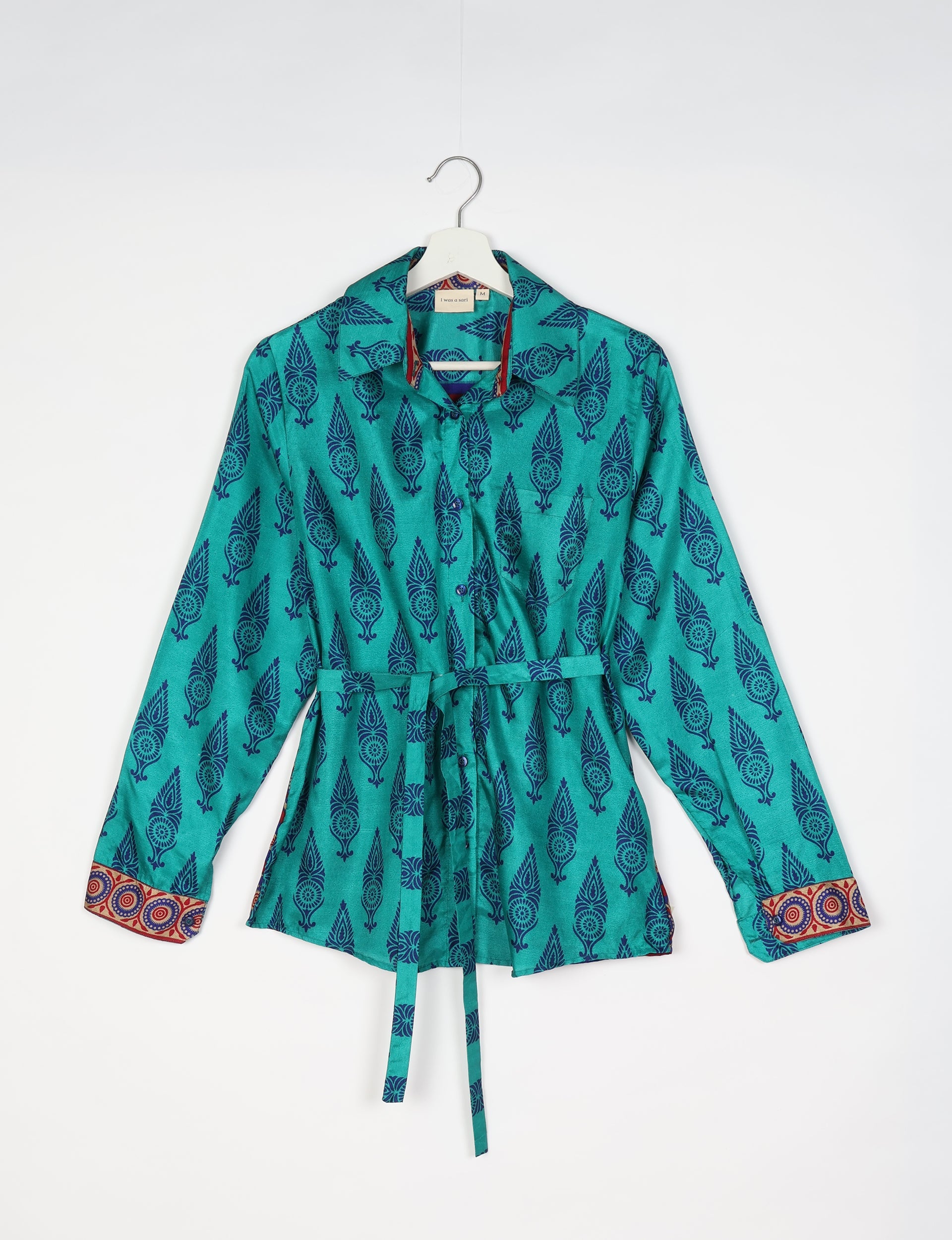 Chemise ajustée à manches longues, avec col semi-italien, boutonnage sur le devant et poche avant. Elle est dotée de poignets standard avec boutons. La chemise comprend une ceinture amovible dans le même tissu, qui peut être portée à la taille ou autour du cou comme une cravate.