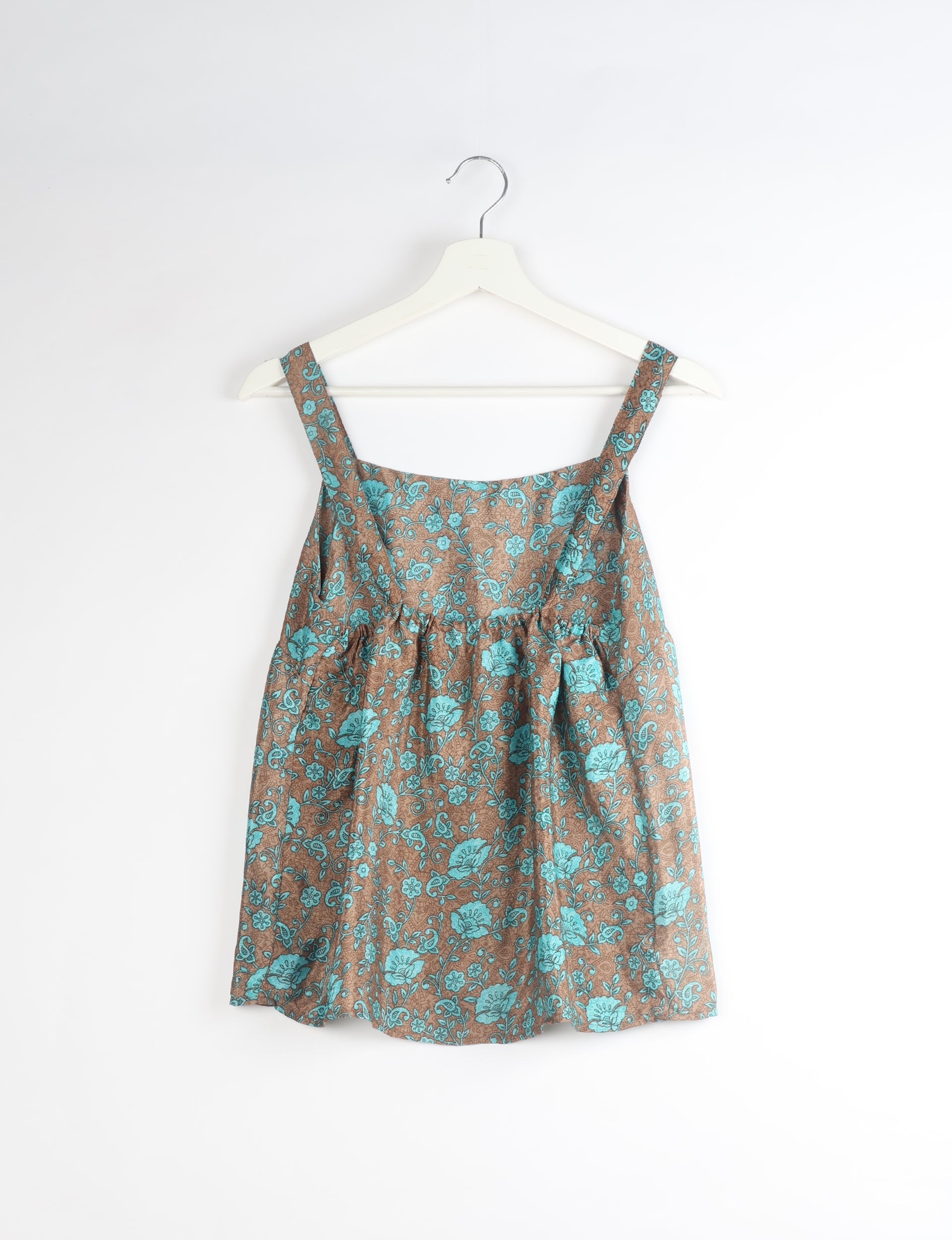 Haut sans manches à encolure carrée et larges bretelles. Le devant est confectionné avec un corsage droit épuré pour une coupe ajustée. Le dos présente un empiècement froncé sous la ligne des épaules, qui apporte du volume et de l'aisance au niveau du bas du corps.