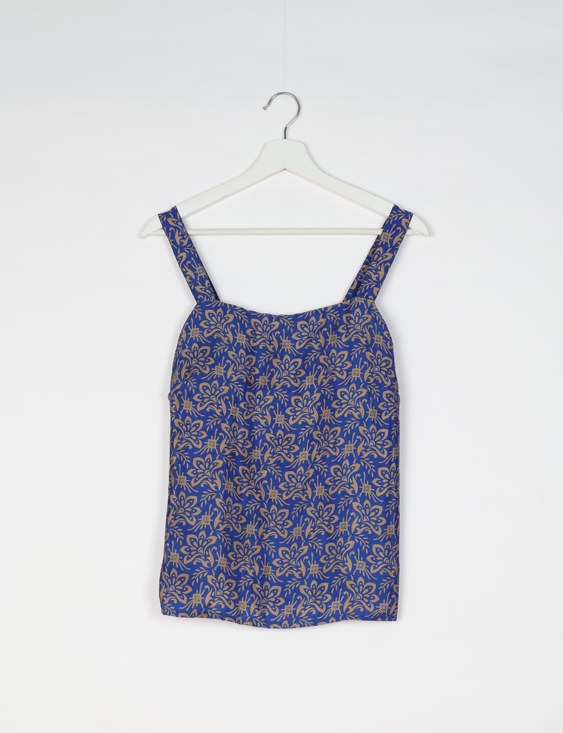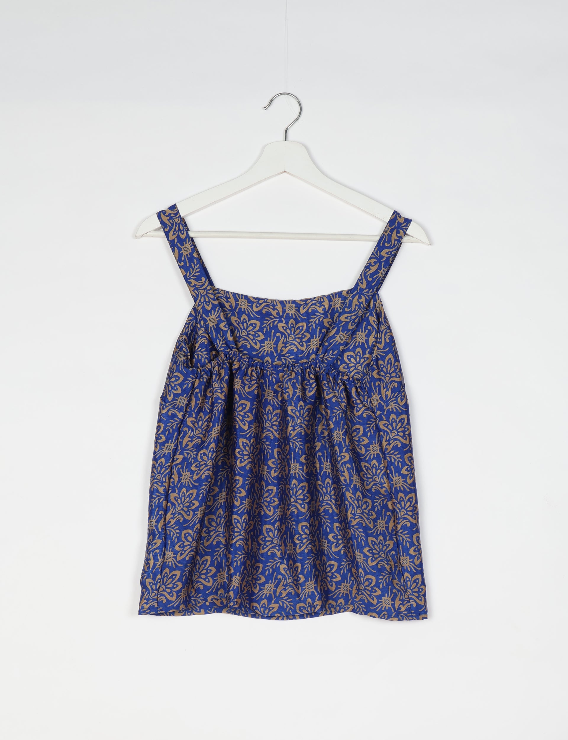 Haut sans manches à encolure carrée et larges bretelles. Le devant est confectionné avec un corsage droit épuré pour une coupe ajustée. Le dos présente un empiècement froncé sous la ligne des épaules, qui apporte du volume et de l'aisance au niveau du bas du corps.