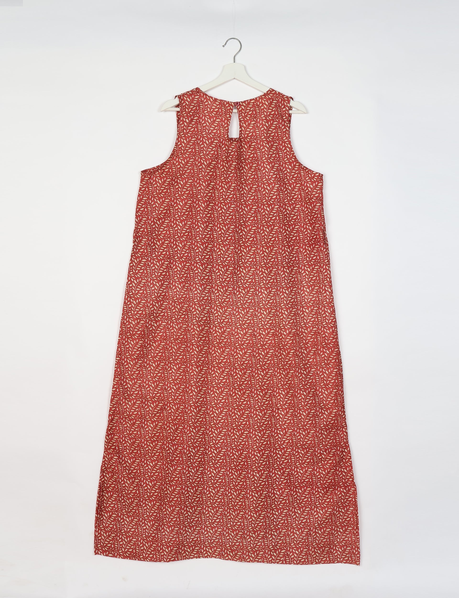 Questo è un abito maxi senza maniche a linea A con scollo tondo e silhouette lunga fino ai piedi che si allarga gradualmente dalle spalle all’orlo. Presenta un’apertura a goccia sul retro dello scollo, chiusa con asola e bottone.