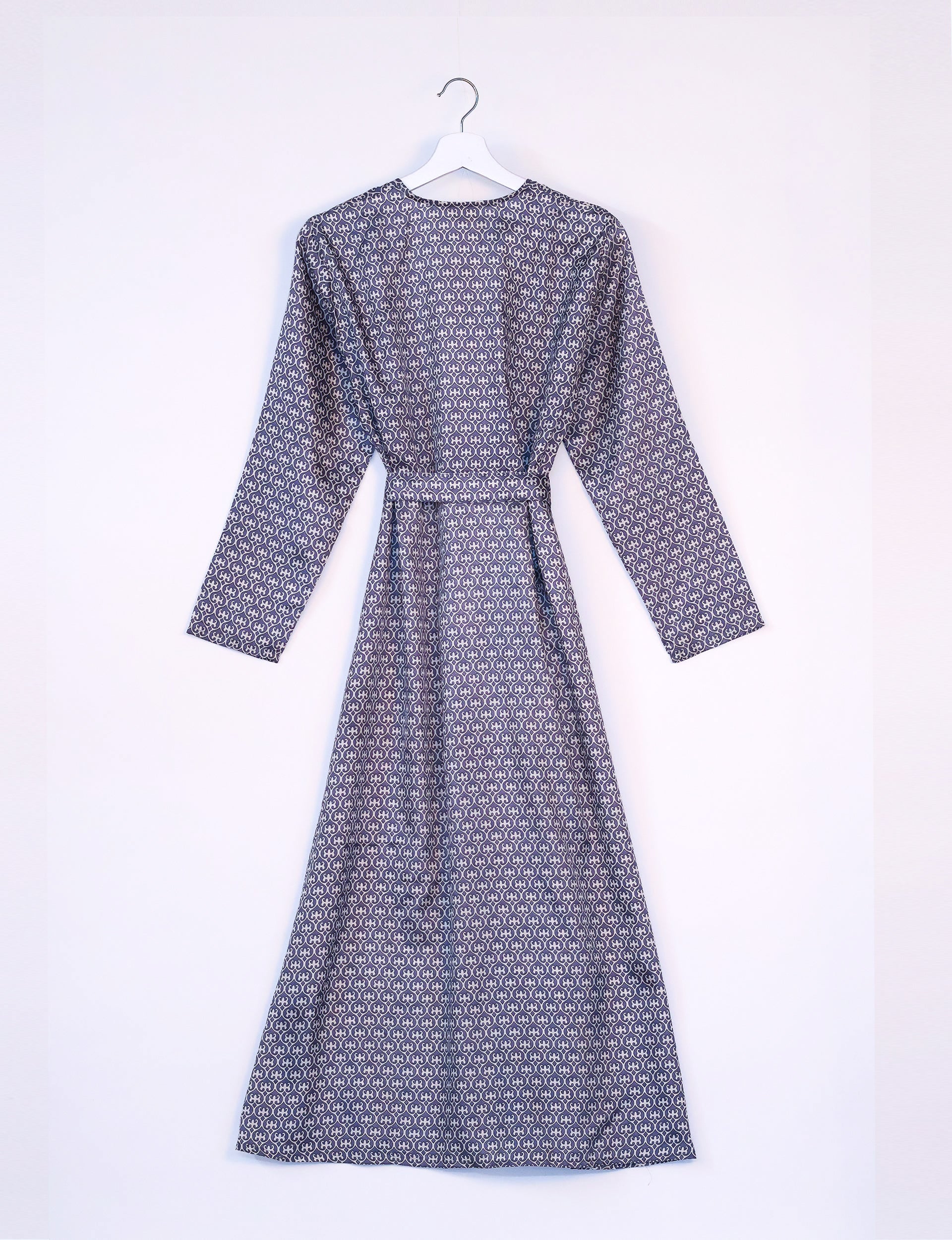 Accappatoio lungo con cintura da annodare. Realizzato con maniche lunghe e orlo dritto.