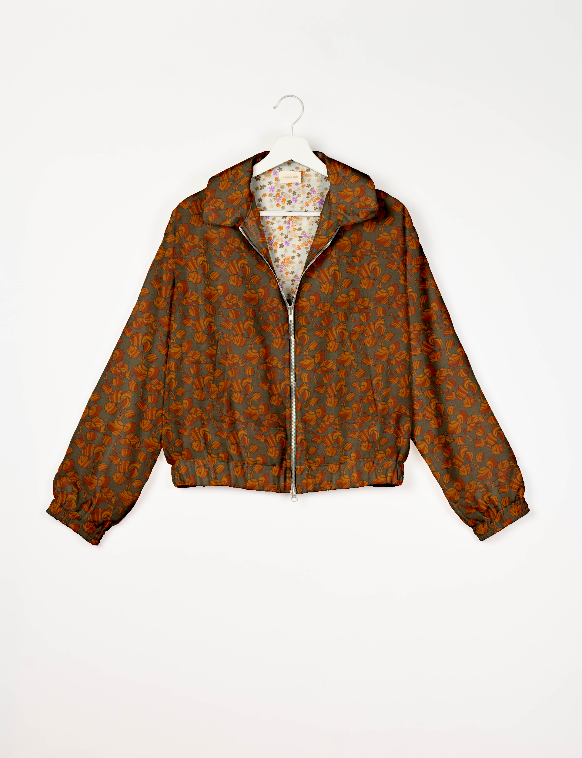 Caratterizzata da una linea corta, con fondo e polsini elasticizzati, la giacca presenta due tasche a filetto e una doppia zip metallica sul davanti. Internamente è rifinita con fodera in sari a contrasto, visibile anche sul collo a rovescio. Leggera ma confortevole, è lo strato ideale per le giornate primaverili, le serate fresche o gli spazi climatizzati.