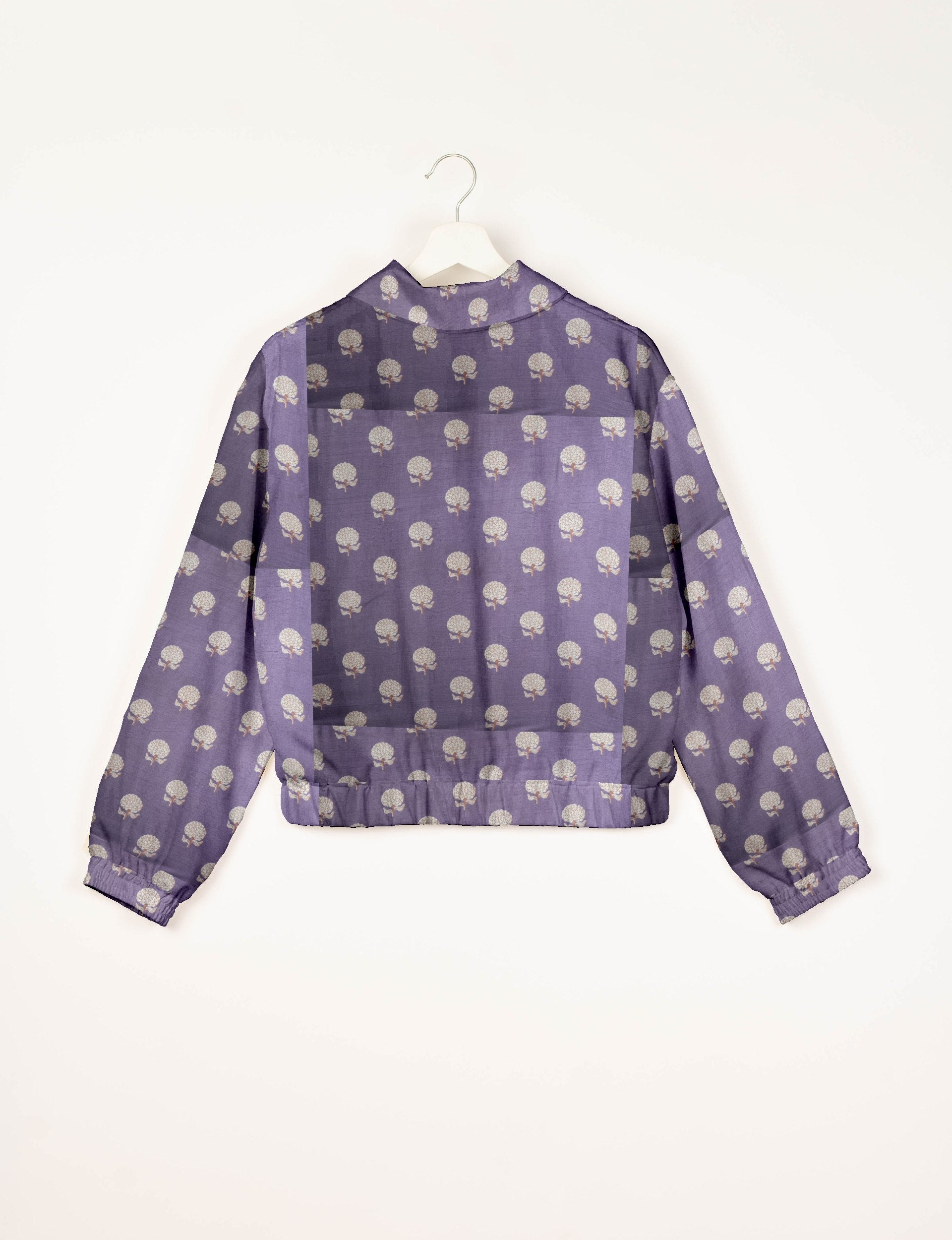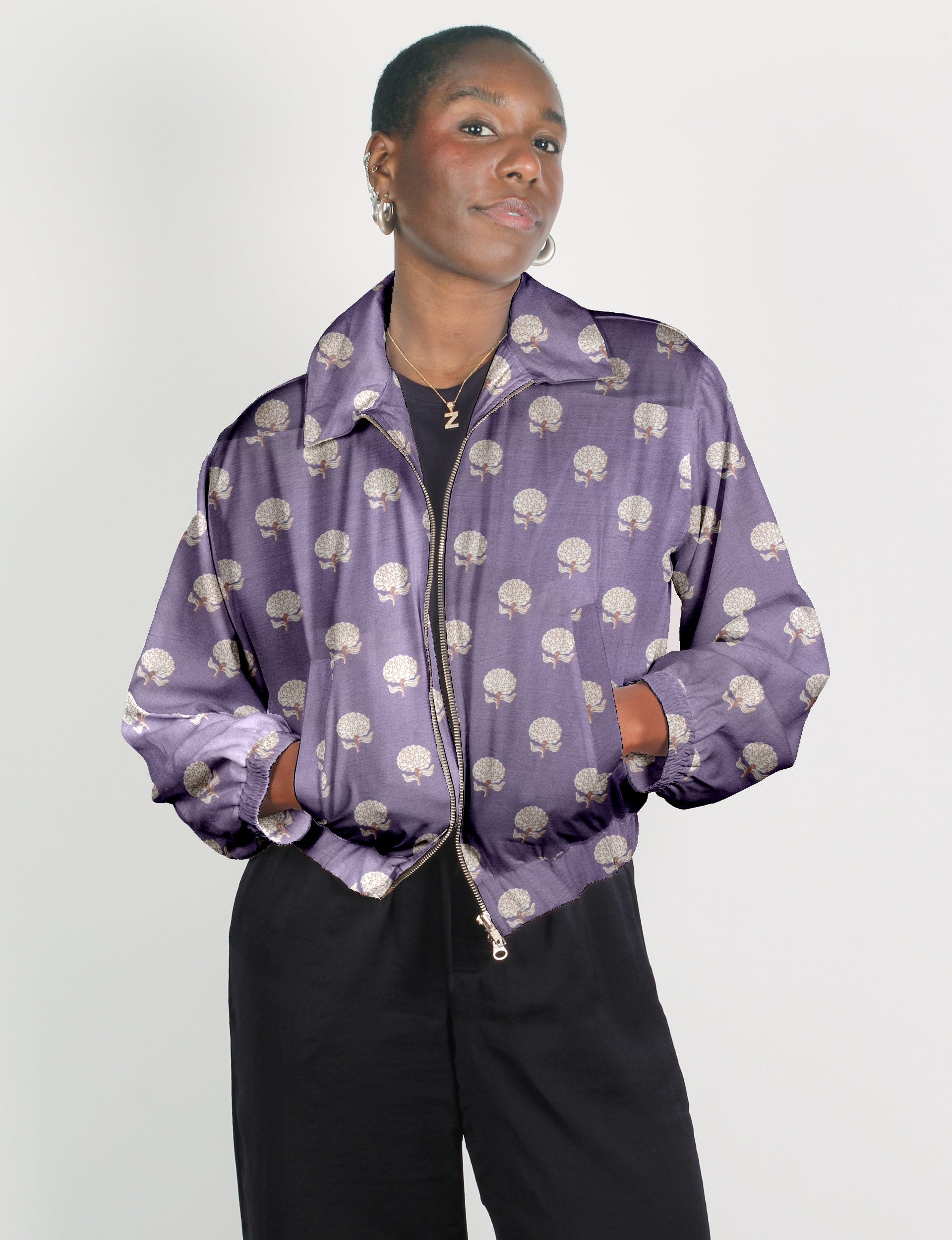 Caratterizzata da una linea corta, con fondo e polsini elasticizzati, la giacca presenta due tasche a filetto e una doppia zip metallica sul davanti. Internamente è rifinita con fodera in sari a contrasto, visibile anche sul collo a rovescio. Leggera ma confortevole, è lo strato ideale per le giornate primaverili, le serate fresche o gli spazi climatizzati.