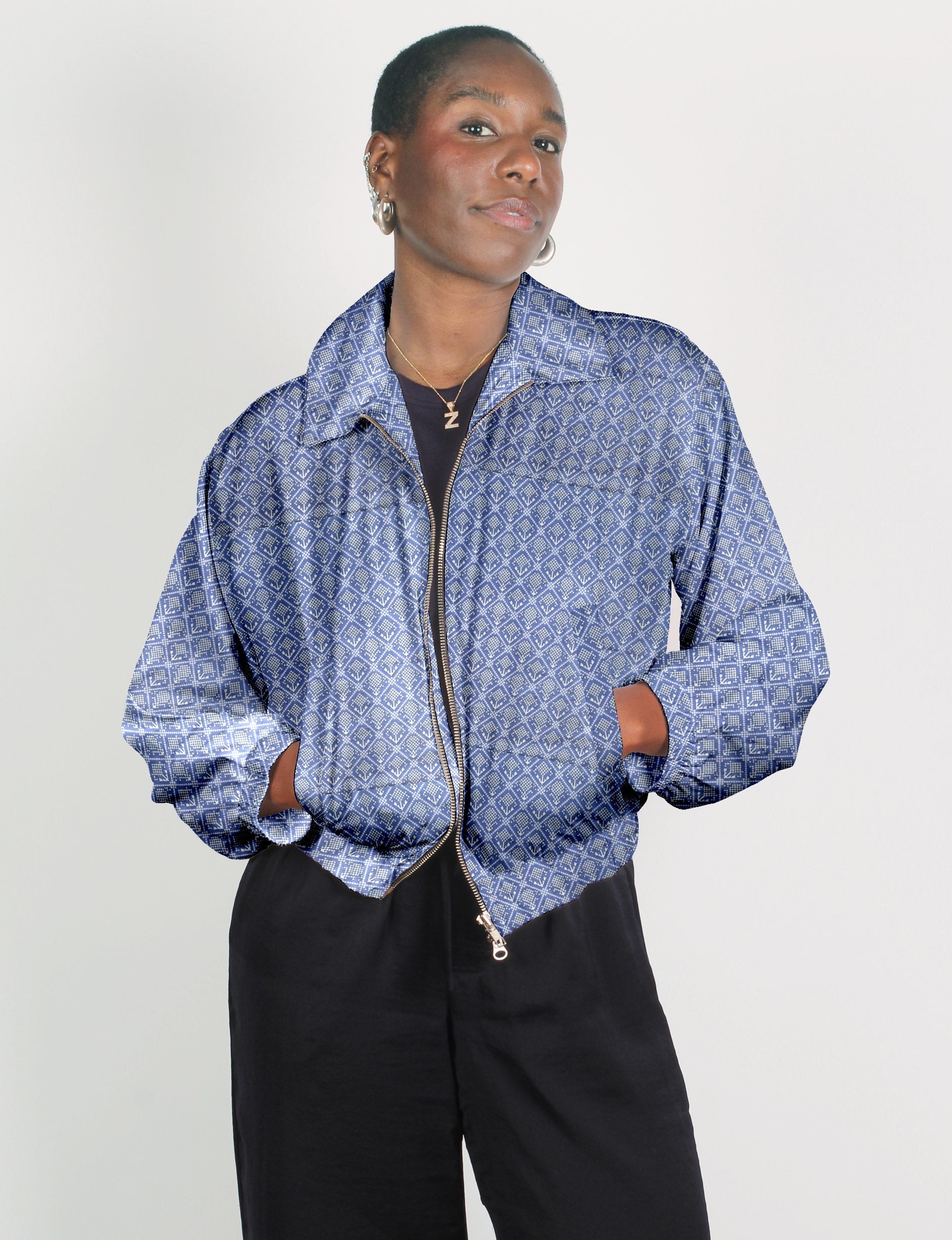 Caratterizzata da una linea corta, con fondo e polsini elasticizzati, la giacca presenta due tasche a filetto e una doppia zip metallica sul davanti. Internamente è rifinita con fodera in sari a contrasto, visibile anche sul collo a rovescio. Leggera ma confortevole, è lo strato ideale per le giornate primaverili, le serate fresche o gli spazi climatizzati.