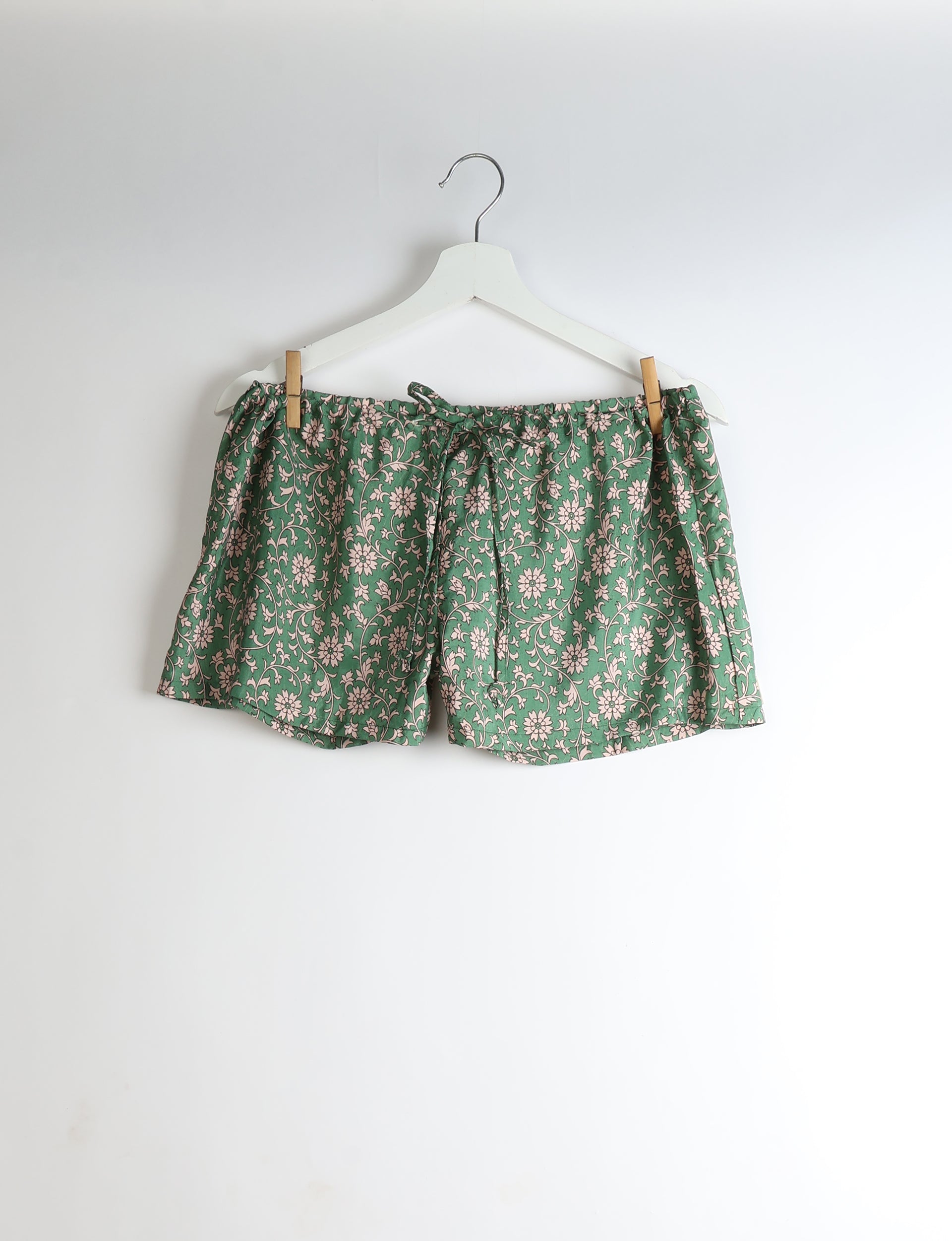 Completo loungewear in due pezzi composto da canotta e shorts coordinati. La canotta presenta scollo a V, sottili spalline regolabili e profili in pizzo smerlato lungo scollo e orlo. Gli shorts hanno vita elasticata con coulisse funzionale e una morbida linea dritta.