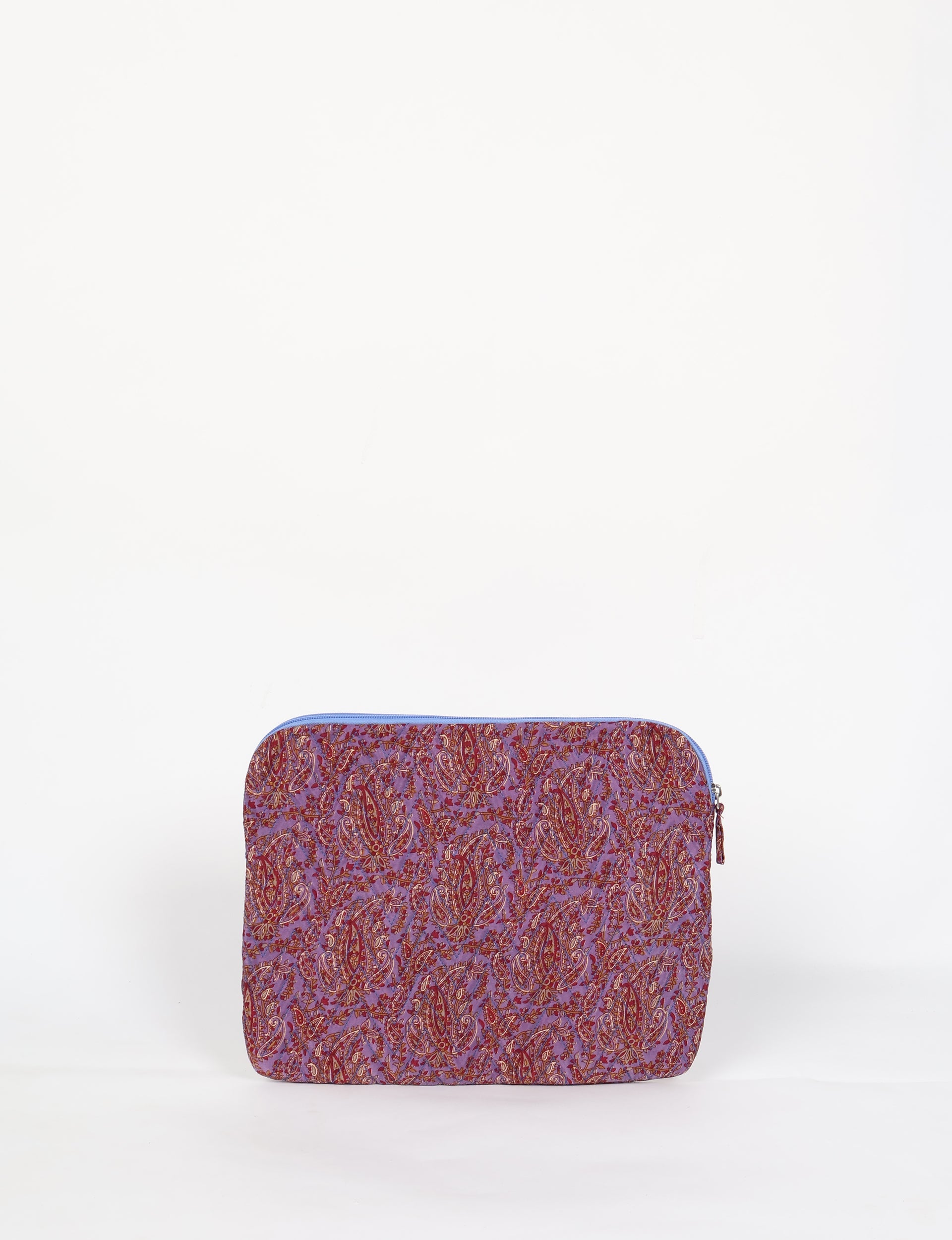 Custodia imbottita con pannelli trapuntati a chevron in sari, pensata per laptop da 15–16”. Interno a contrasto e chiusura con zip in nylon e cursore in metallo.