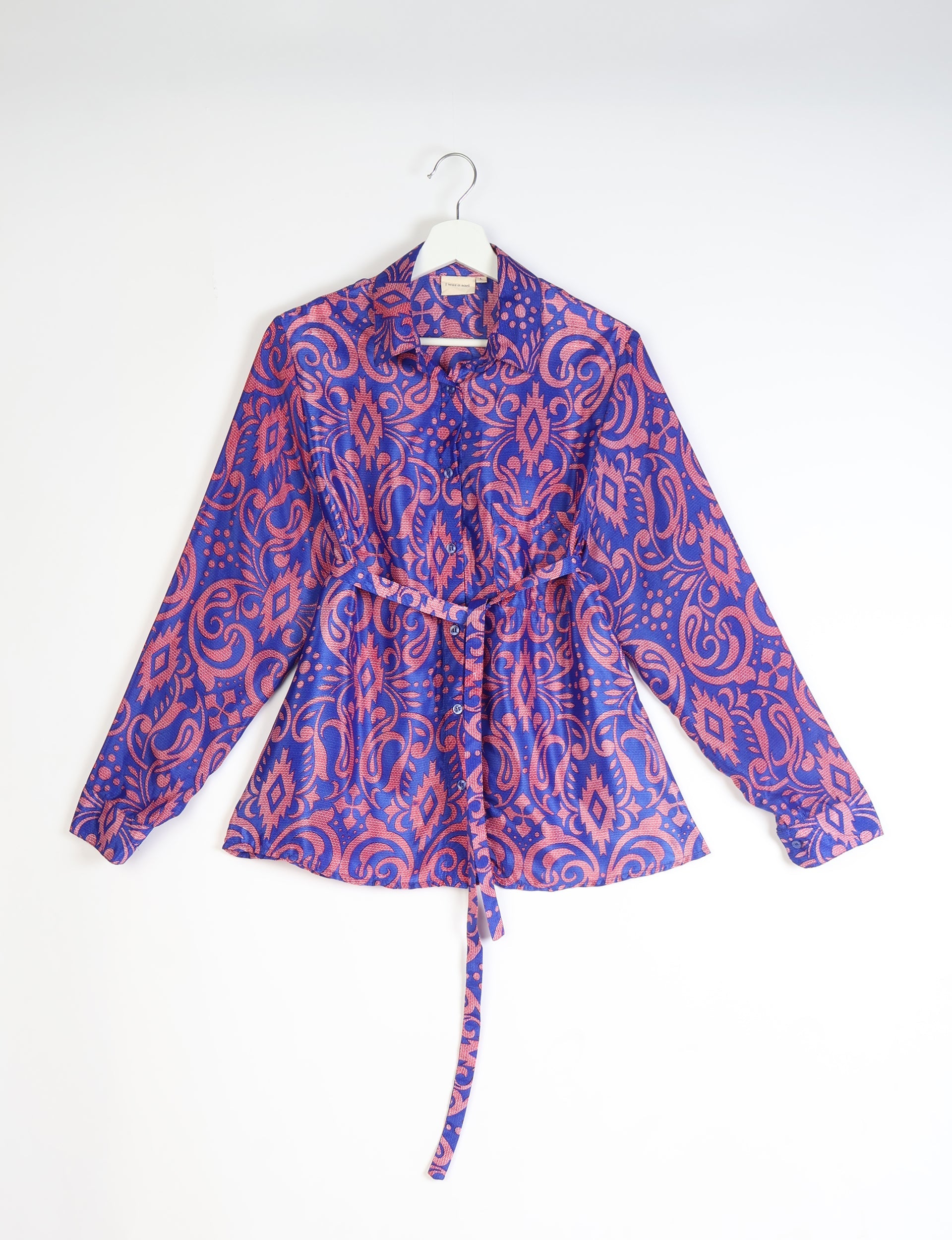 Camicia slim fit a maniche lunghe con colletto semi-spread e abbottonatura frontale. Presenta una tasca sul davanti e polsini classici con chiusura a bottone. È completata da una cintura rimovibile nello stesso tessuto, utilizzabile sia in vita sia come cravatta al collo.