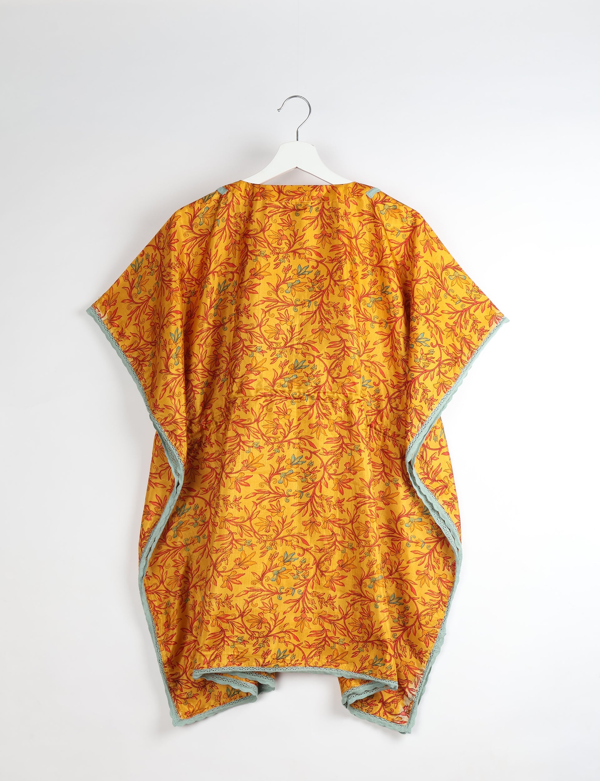 Caftano a lunghezza coscia con vestibilità morbida, scollo a V e maniche ampie. Presenta coulisse regolabile in vita con nappine decorate da perline. Rifinito con pizzi a contrasto lungo scollo, fianchi e orlo.