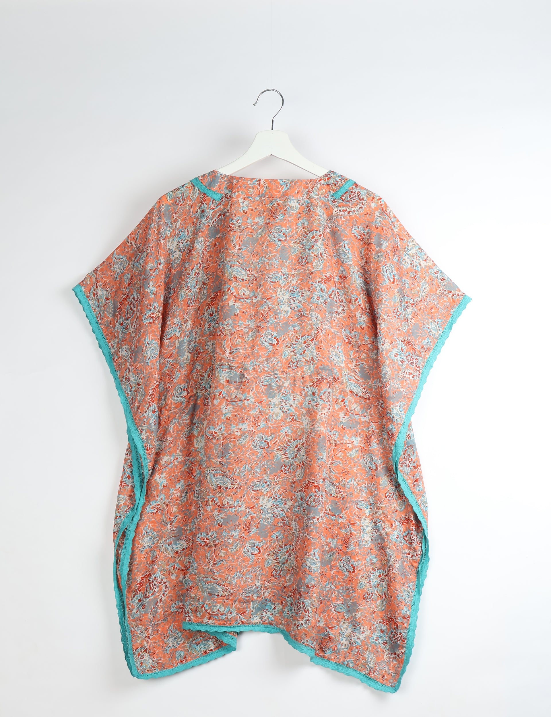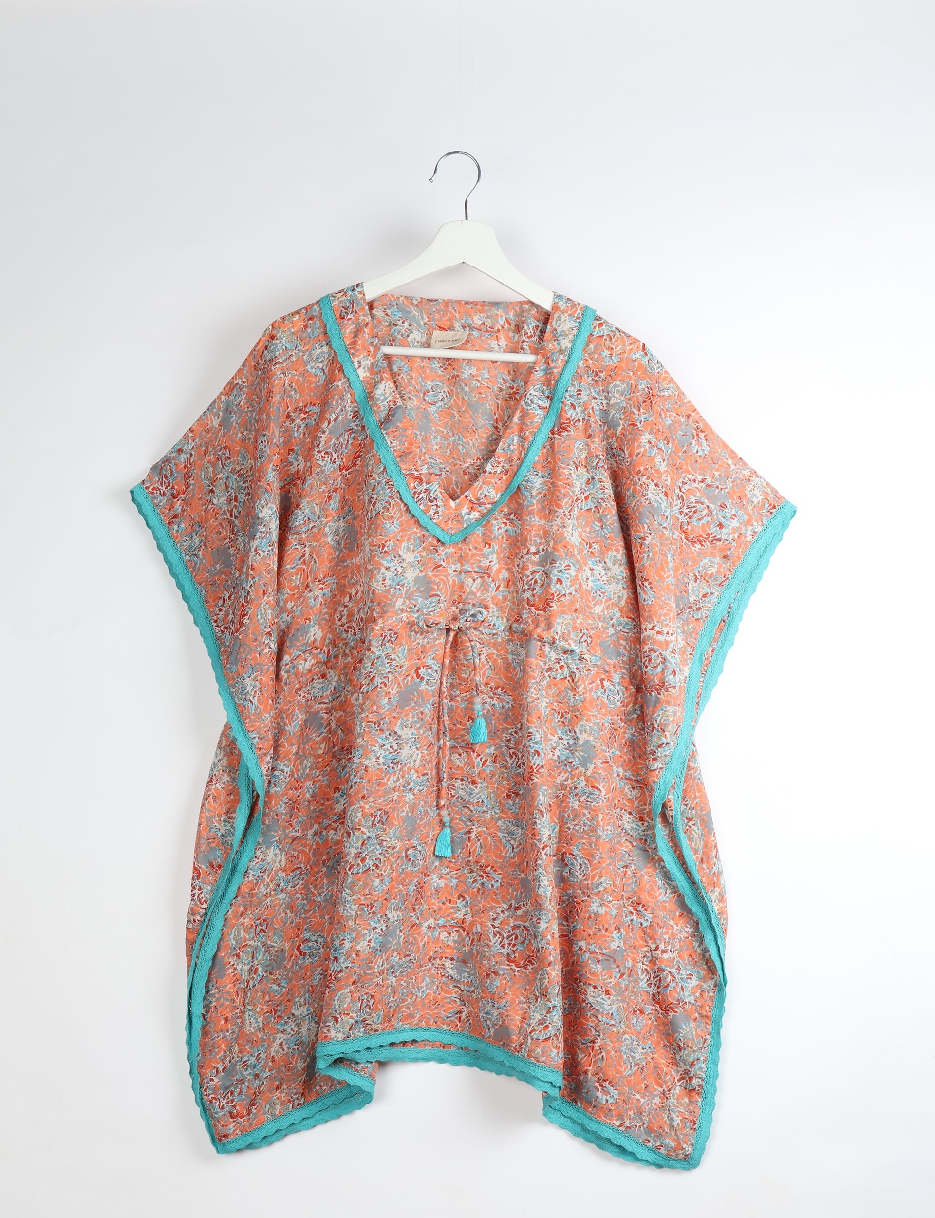 Caftano a lunghezza coscia con vestibilità morbida, scollo a V e maniche ampie. Presenta coulisse regolabile in vita con nappine decorate da perline. Rifinito con pizzi a contrasto lungo scollo, fianchi e orlo.