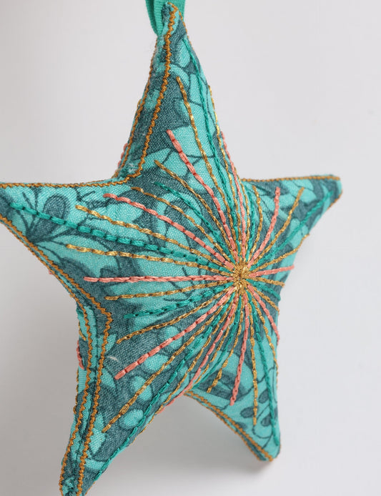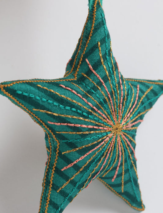 The star shaped decoration is made from preloved saris and filled with organic cotton filling. Embroidered with vibrant silk and metallic gold thread and hand finished. Lighting and screens may cause slight variations in color appearance.