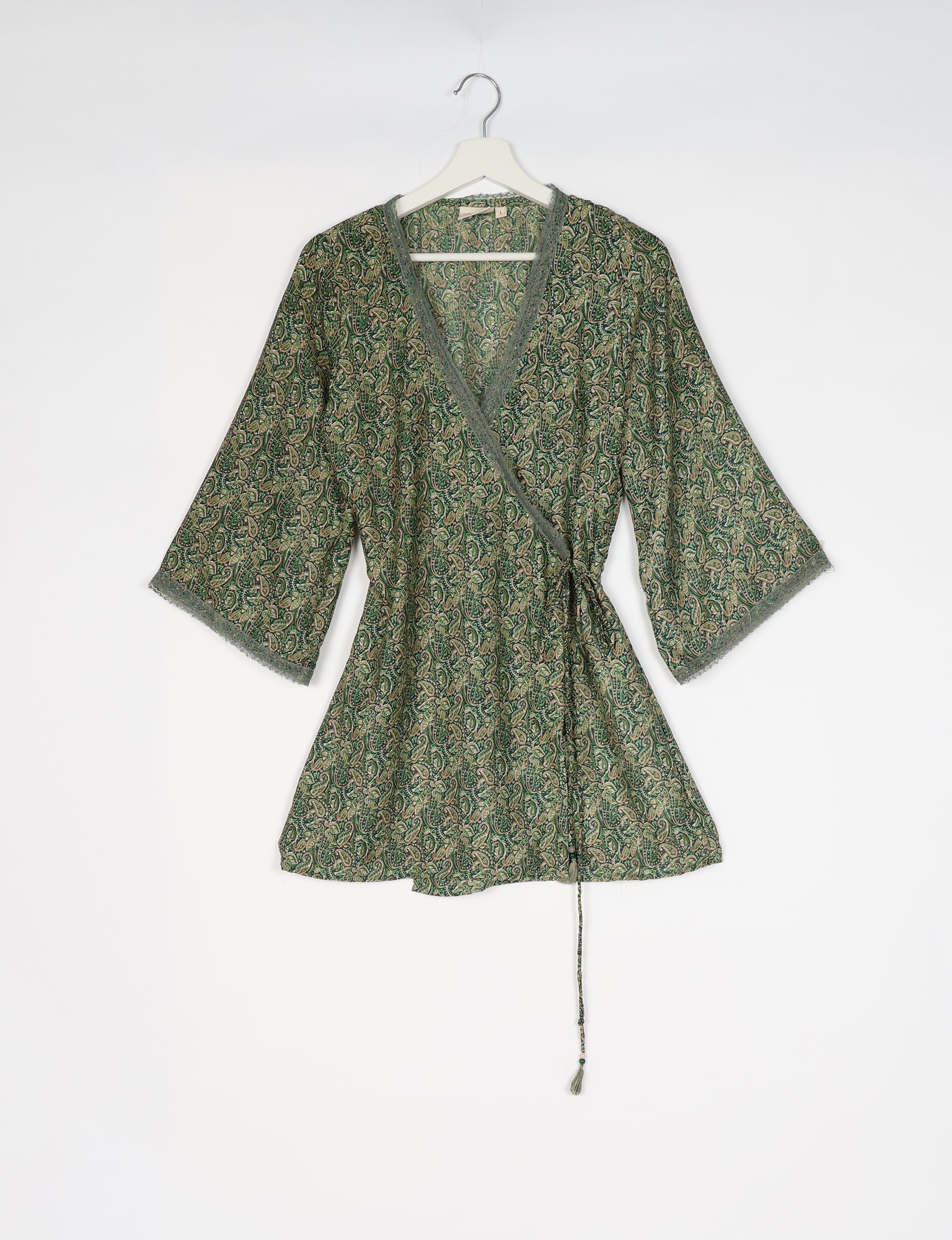 Completo coordinato in due pezzi con tunica incrociata a V e pantaloni a gamba larga. La tunica ha maniche a 3/4 e si chiude in vita con una cintura da annodare. Il top include un bordo in pizzo a contrasto lungo i margini principali.