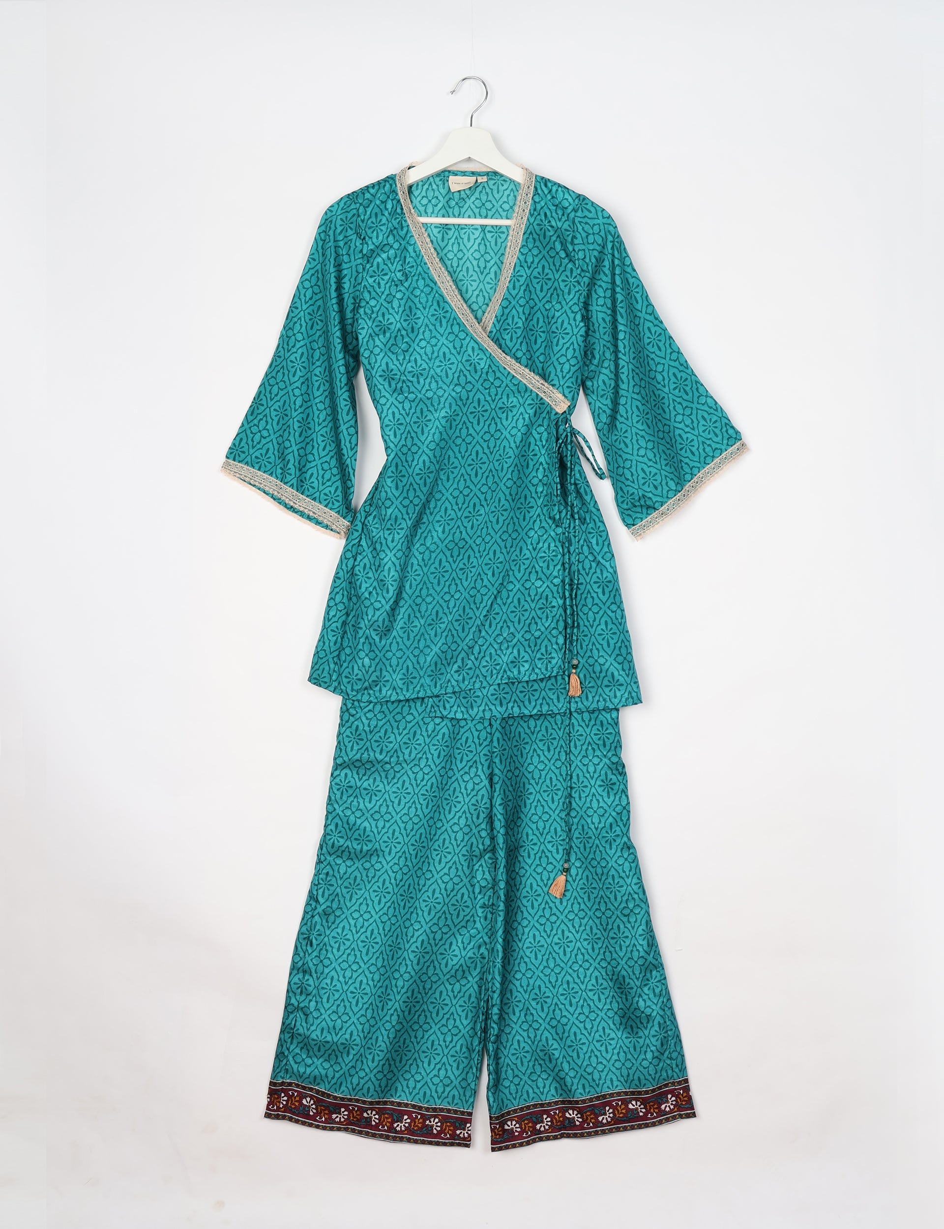 Completo coordinato in due pezzi con tunica incrociata a V e pantaloni a gamba larga. La tunica ha maniche a 3/4 e si chiude in vita con una cintura da annodare. Il top include un bordo in pizzo a contrasto lungo i margini principali.