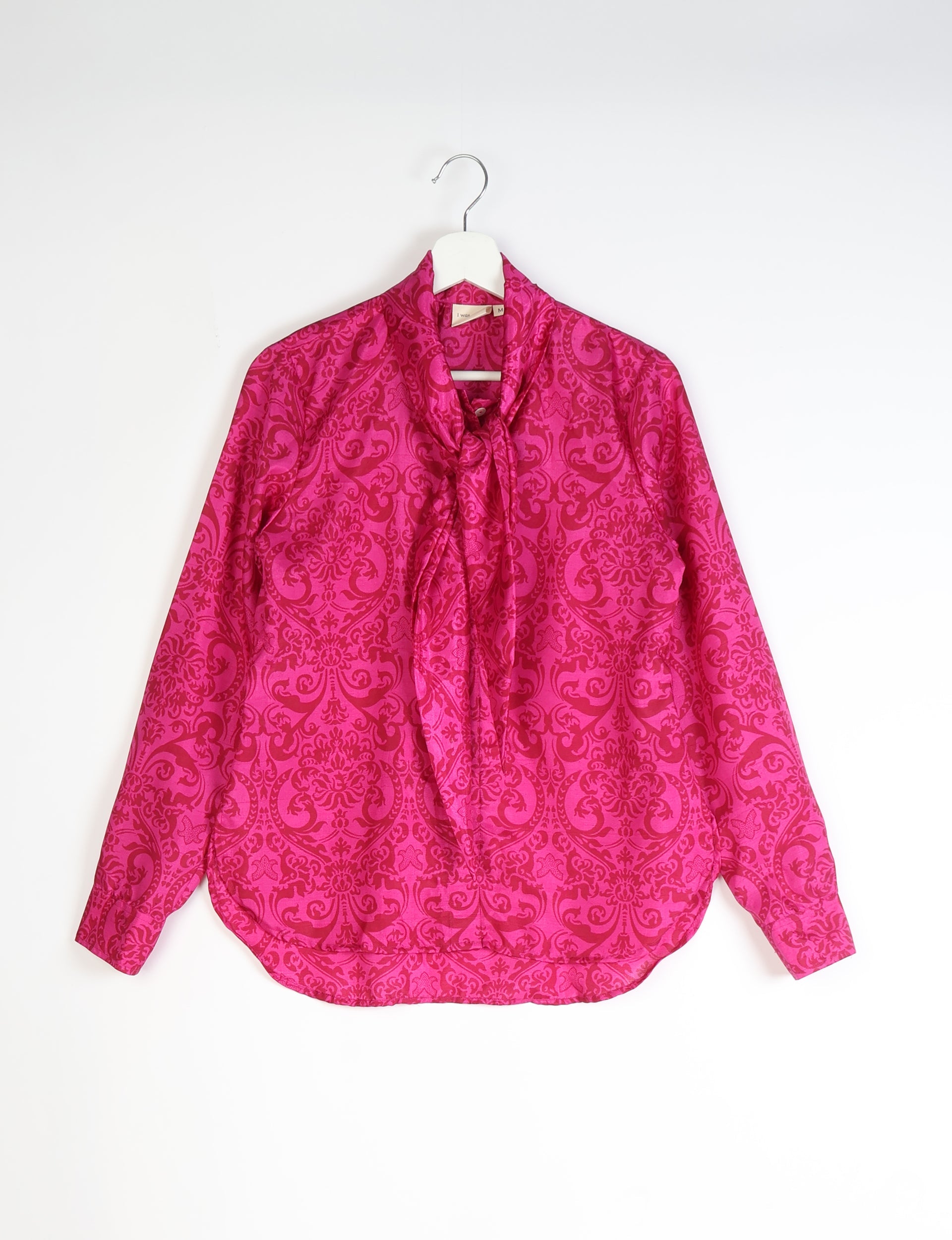 Camicia a maniche lunghe con vestibilità rilassata e abbottonatura frontale rifinita con un nastro dello stesso tessuto da annodare al collo. L’orlo è arrotondato e le maniche lunghe sono completate da polsini con bottoni per una finitura strutturata.