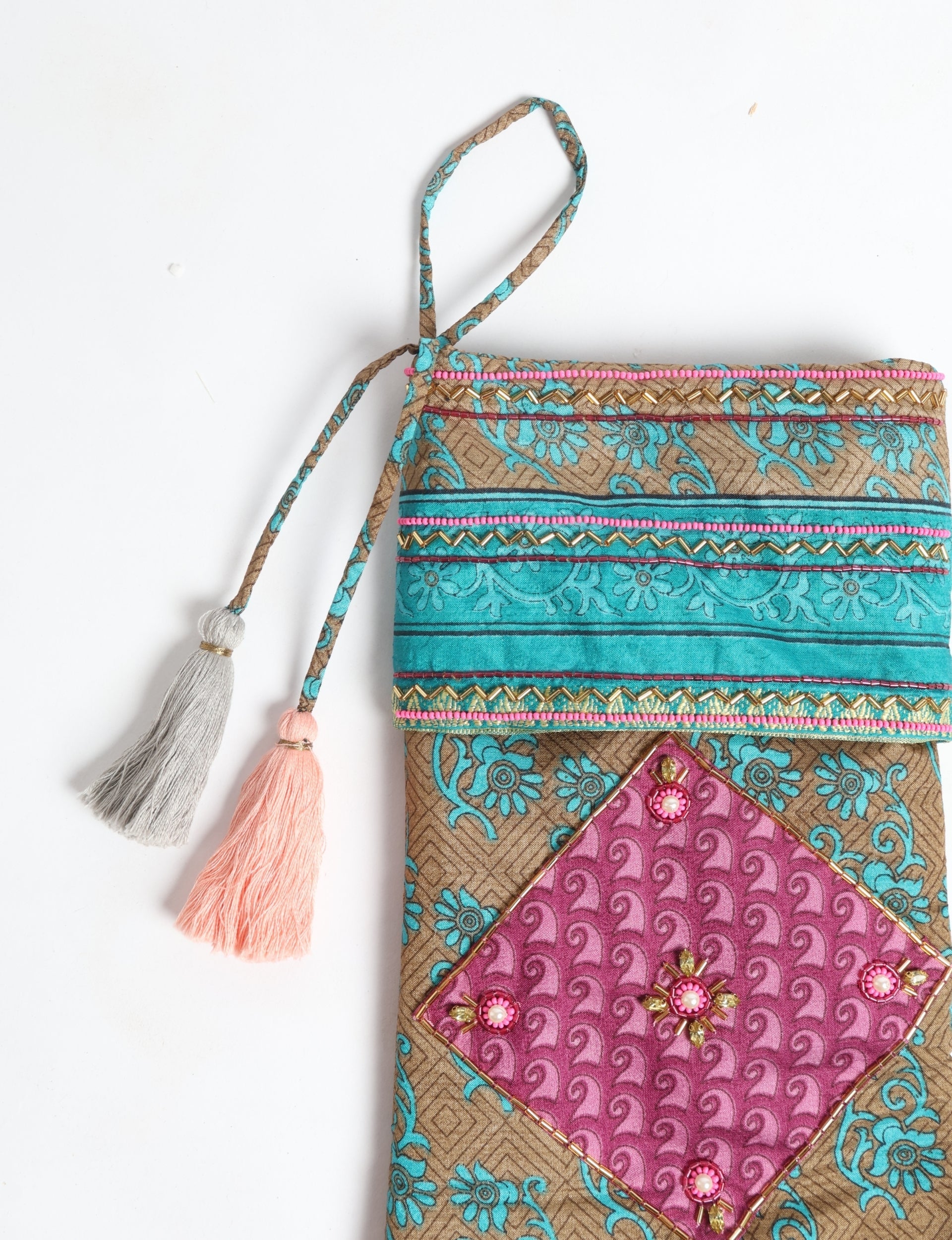 The Cheer Christmas stocking is crafted from a vibrant palette of preloved saris with patchwork detailing, exquisite hand embroidered embellishments of stones, sequins, pearls and glass beads and a delicate heart charm ornament with thread tassel. Lighting and screens may cause slight variations in color appearance.