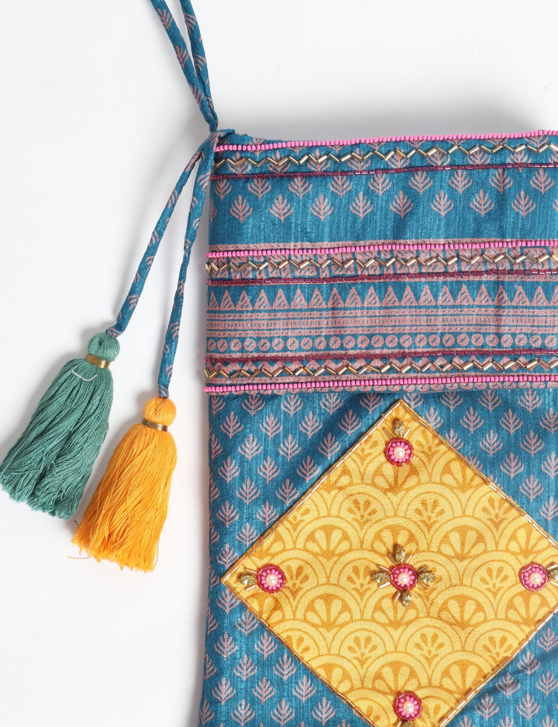 The Cheer Christmas stocking is crafted from a vibrant palette of preloved saris with patchwork detailing, exquisite hand embroidered embellishments of stones, sequins, pearls and glass beads and a delicate heart charm ornament with thread tassel. Lighting and screens may cause slight variations in color appearance.