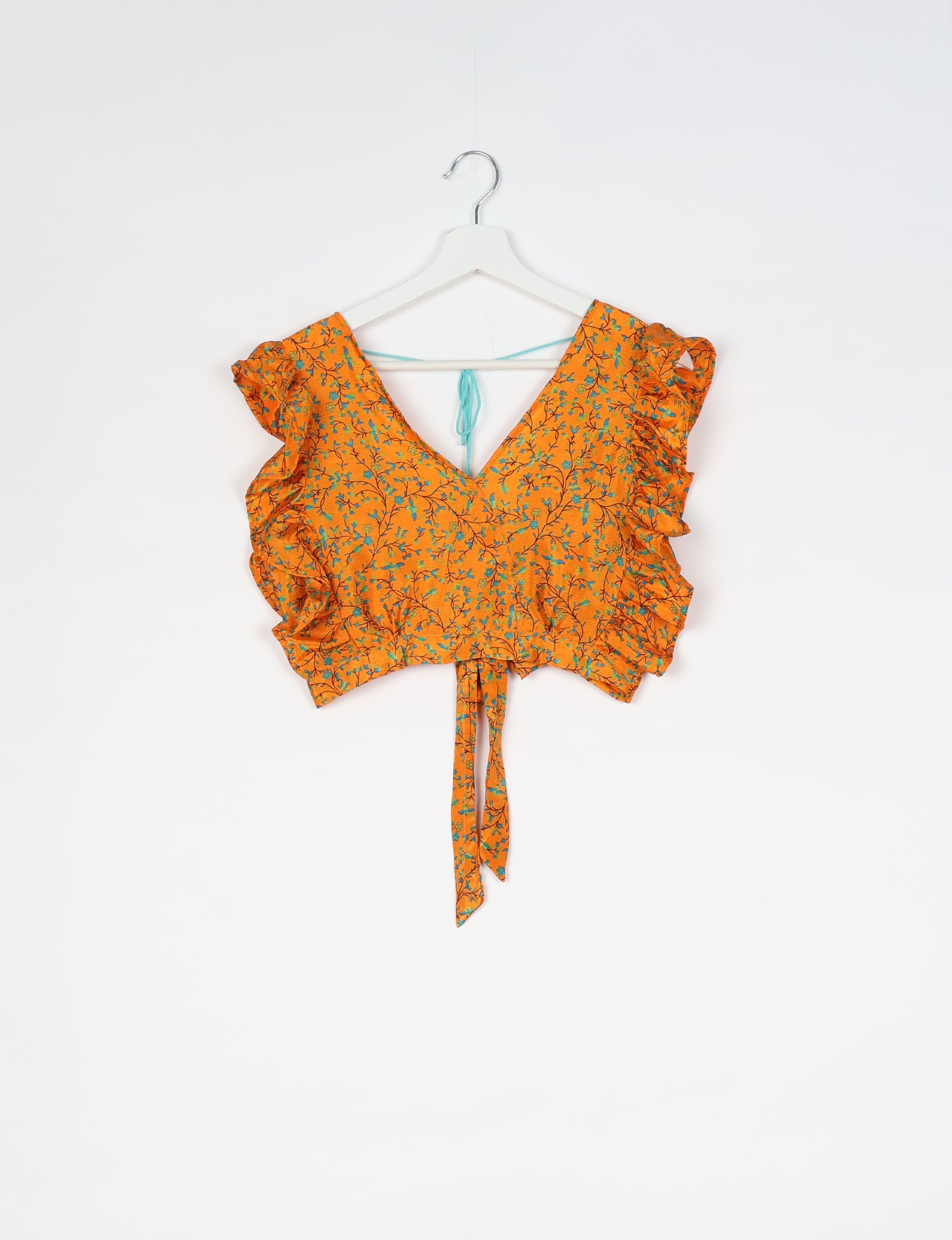 Completo coordinato in due pezzi composto da un crop top e da una gonna a portafoglio con dettaglio volant. Il top presenta uno scollo a V, chiusura posteriore con fiocco e lungo laccio, e maniche corte arricciate. La gonna a portafoglio è disegnata con un pannello frontale asimmetrico, fissata con un laccio laterale e rifinita con un volant cascante lungo l’orlo.