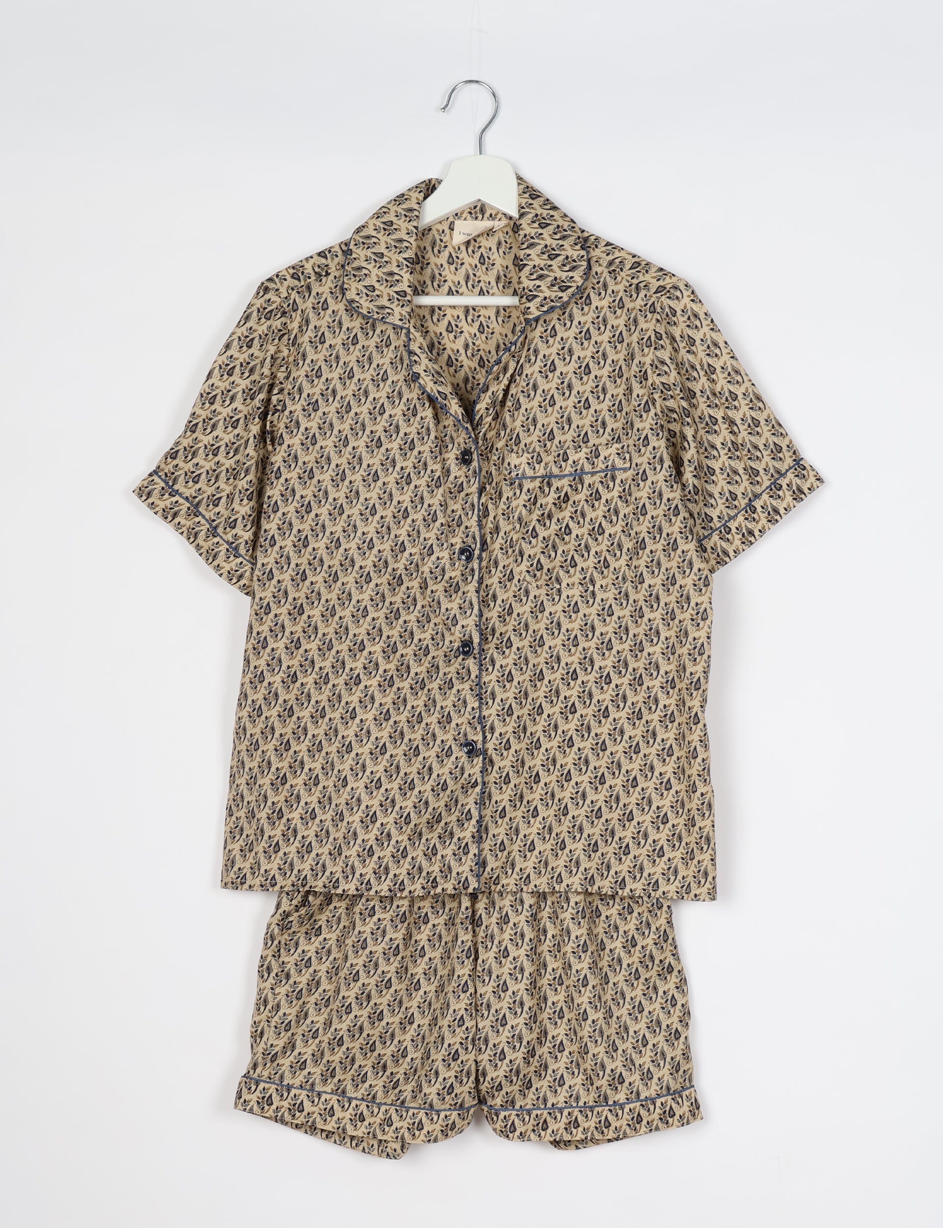 Completo da notte composto da due pezzi, una camicia a maniche corte e pantaloncini elasticizzati. La camicia presenta un colletto a punta, chiusura frontale con bottoni e un taschino singolo con rifiniture a contrasto. I pantaloncini hanno un elastico in vita e polsini a contrasto. Luci e schermi possono causare lievi variazioni nell'aspetto del colore.