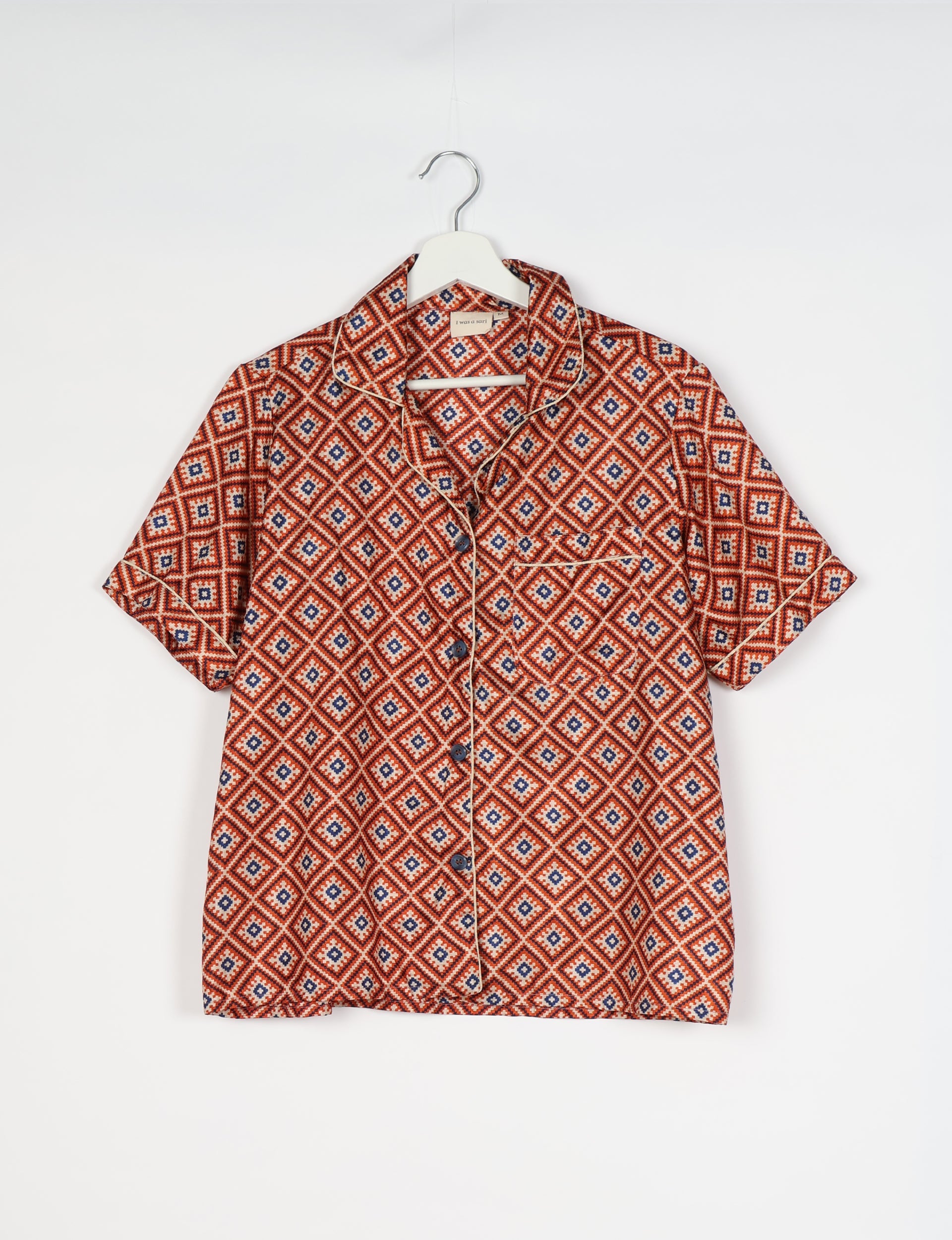 Completo da notte composto da due pezzi, una camicia a maniche corte e pantaloncini elasticizzati. La camicia presenta un colletto a punta, chiusura frontale con bottoni e un taschino singolo con rifiniture a contrasto. I pantaloncini hanno un elastico in vita e polsini a contrasto. Luci e schermi possono causare lievi variazioni nell'aspetto del colore.