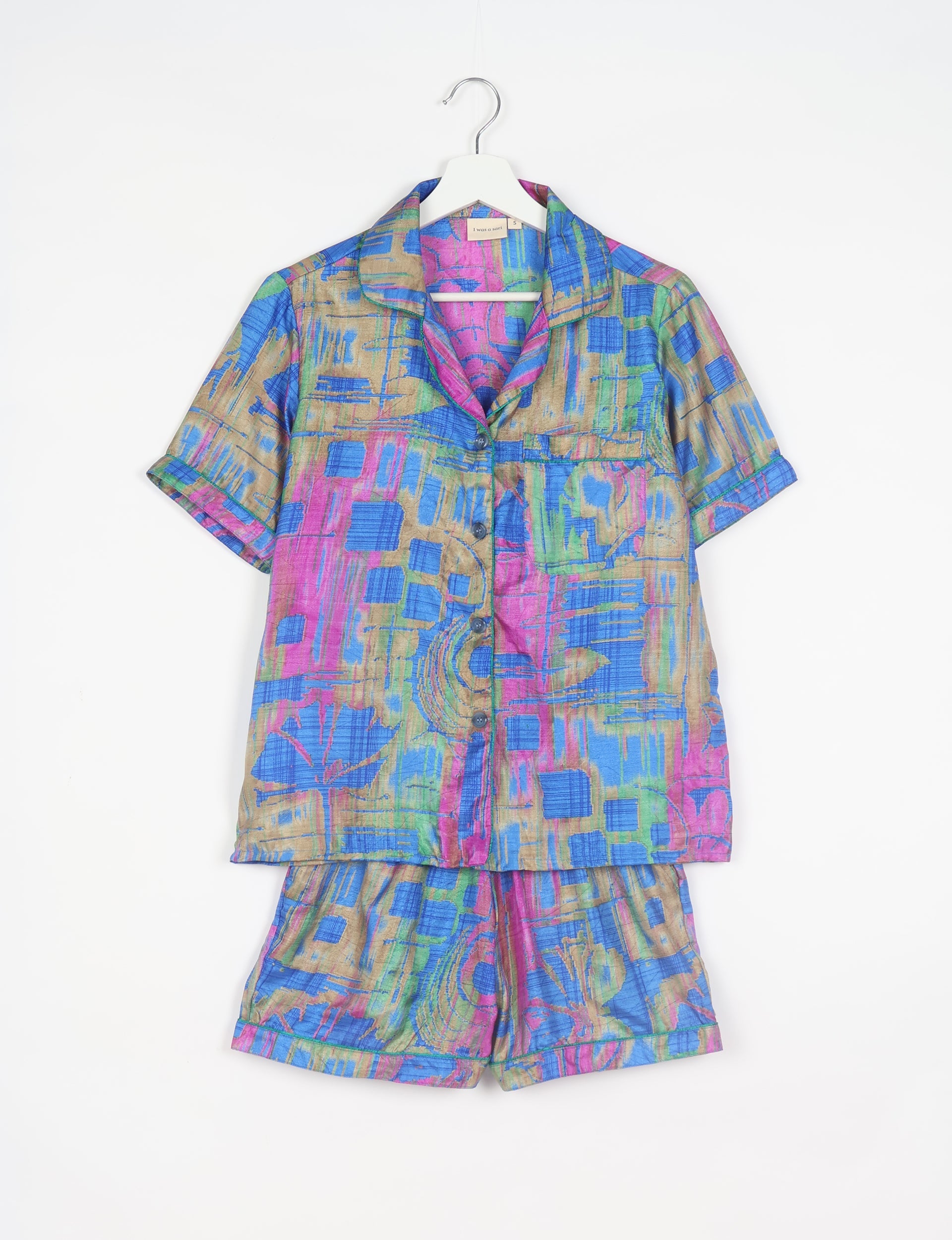 Completo da notte composto da due pezzi, una camicia a maniche corte e pantaloncini elasticizzati. La camicia presenta un colletto a punta, chiusura frontale con bottoni e un taschino singolo con rifiniture a contrasto. I pantaloncini hanno un elastico in vita e polsini a contrasto. Luci e schermi possono causare lievi variazioni nell'aspetto del colore.