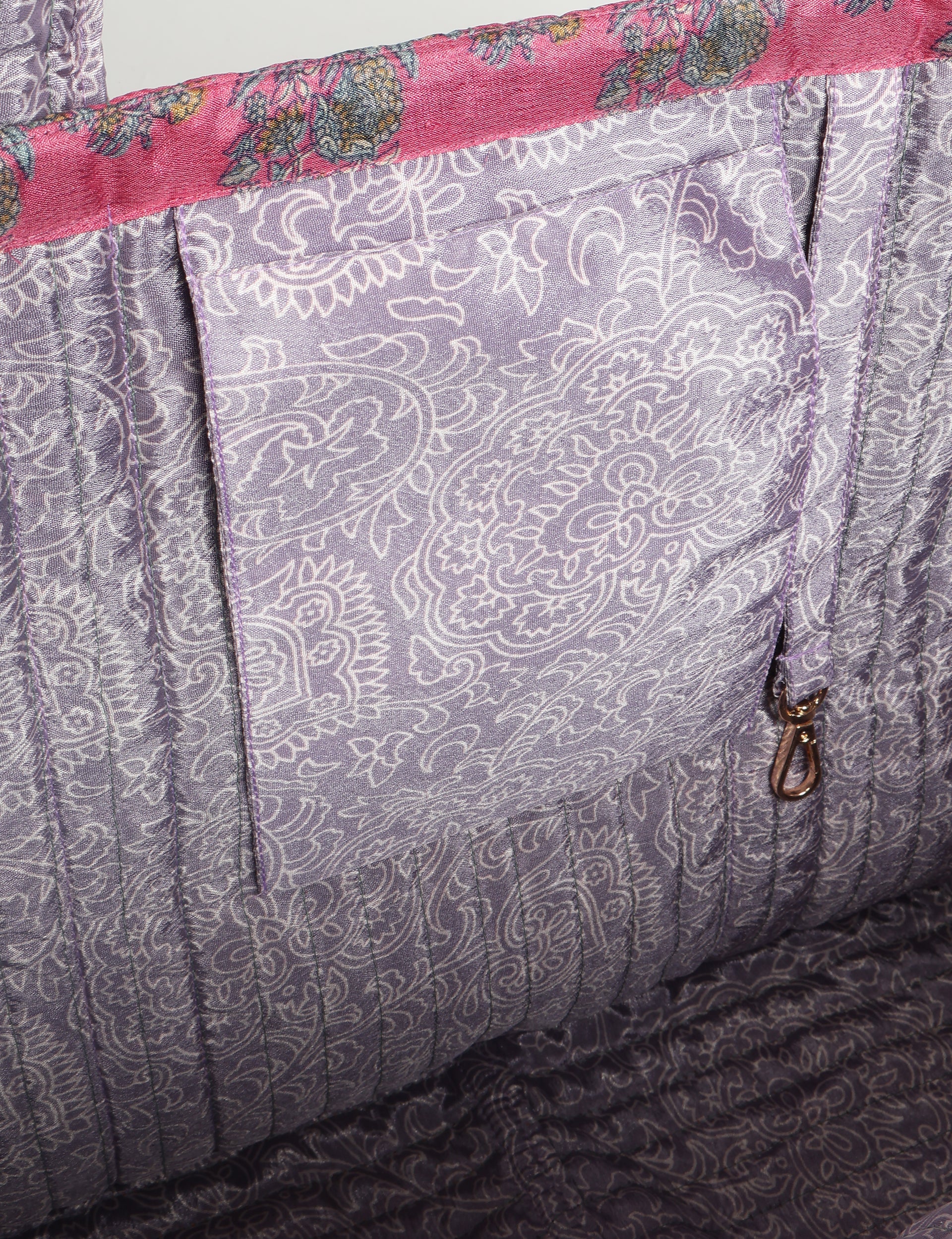 Large tote bag with a quilted construction and structured rectangular form. Designed with long shoulder straps for comfortable carry. Features an external patch pocket and an inside pocket for quick-access storage.