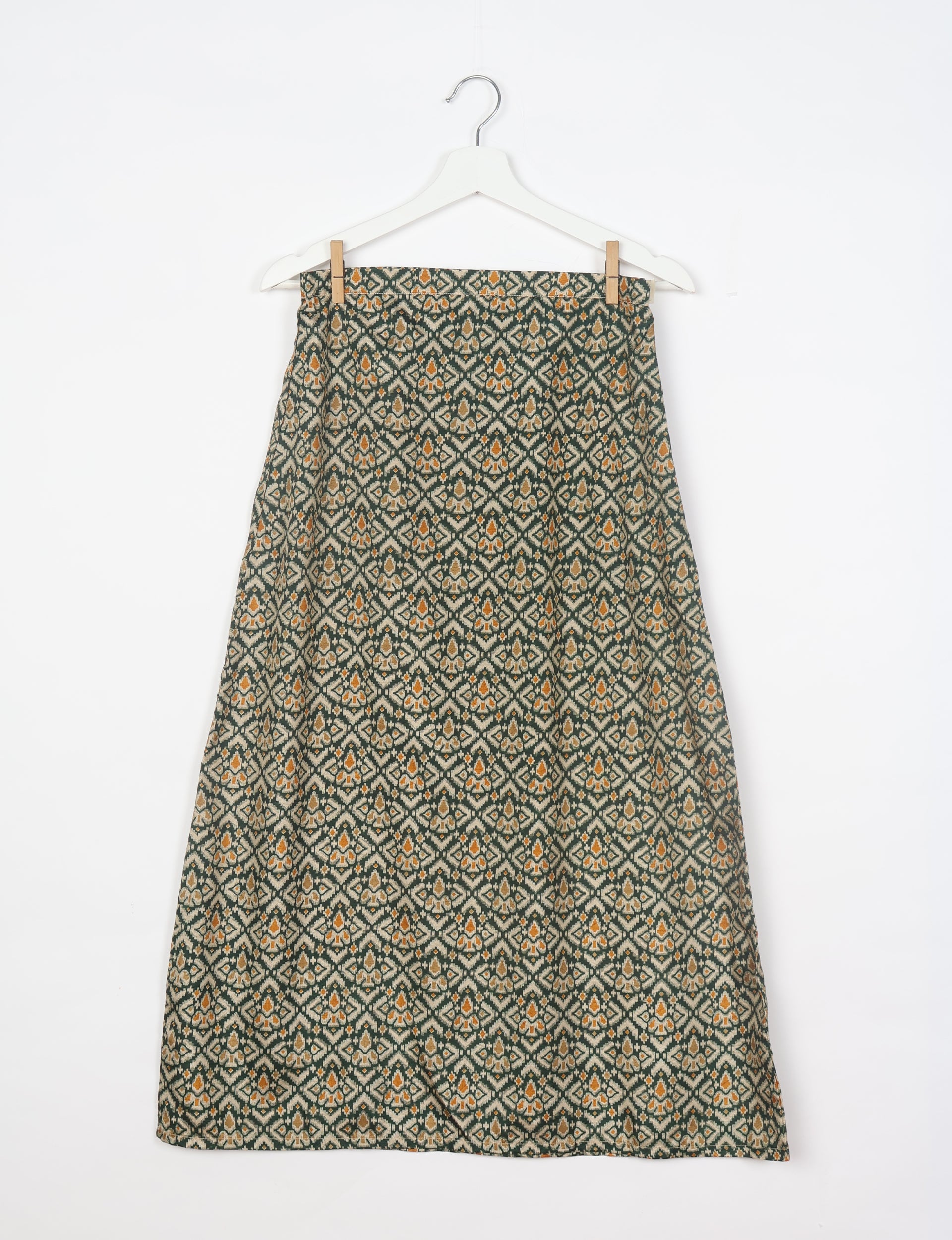 This is a mid-to-ankle length A-line skirt featuring a fitted waistband and flared silhouette. The waistband includes an elasticated back for ease and comfort, while the front remains flat for a clean finish with a button closure.