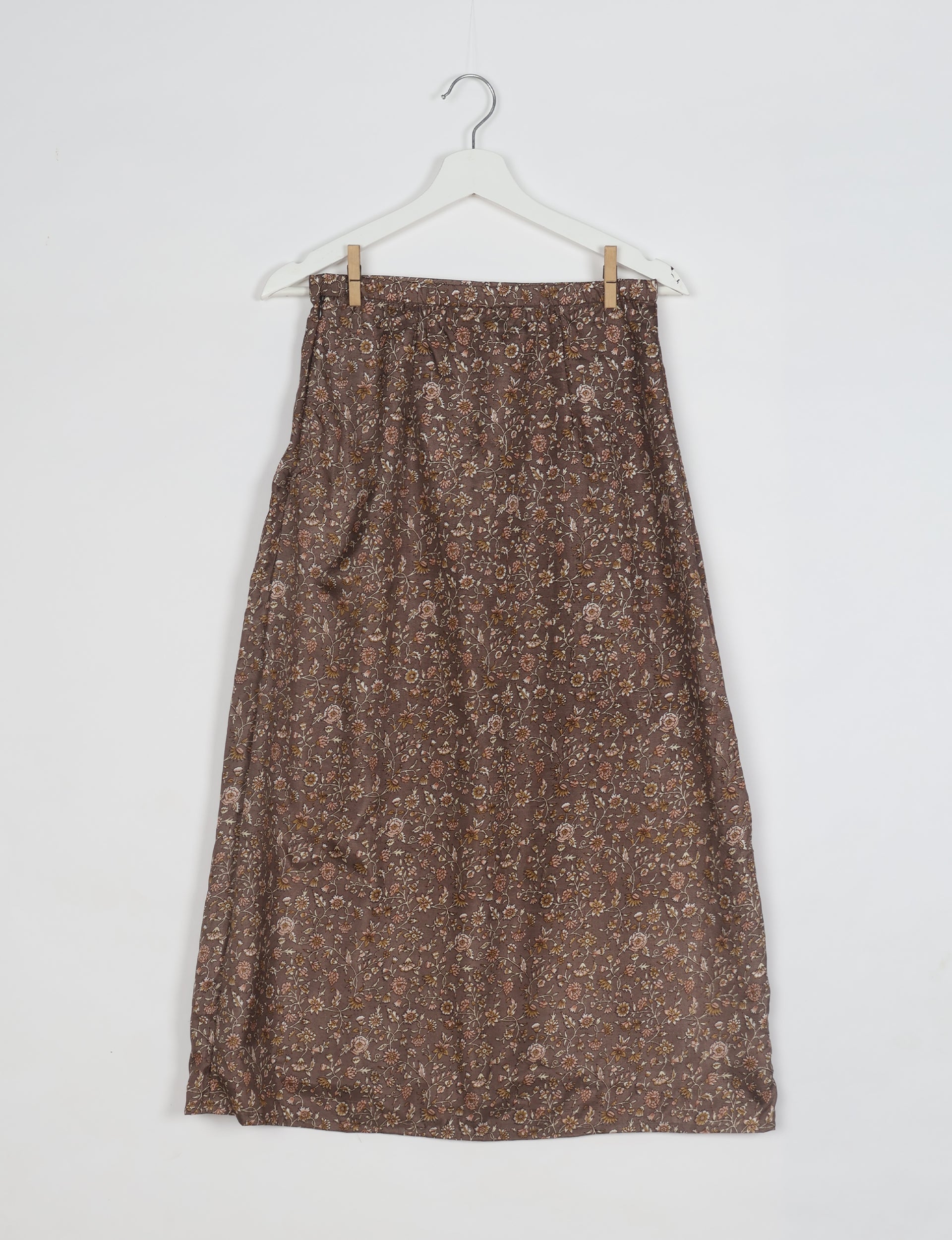 This is a mid-to-ankle length A-line skirt featuring a fitted waistband and flared silhouette. The waistband includes an elasticated back for ease and comfort, while the front remains flat for a clean finish with a button closure.