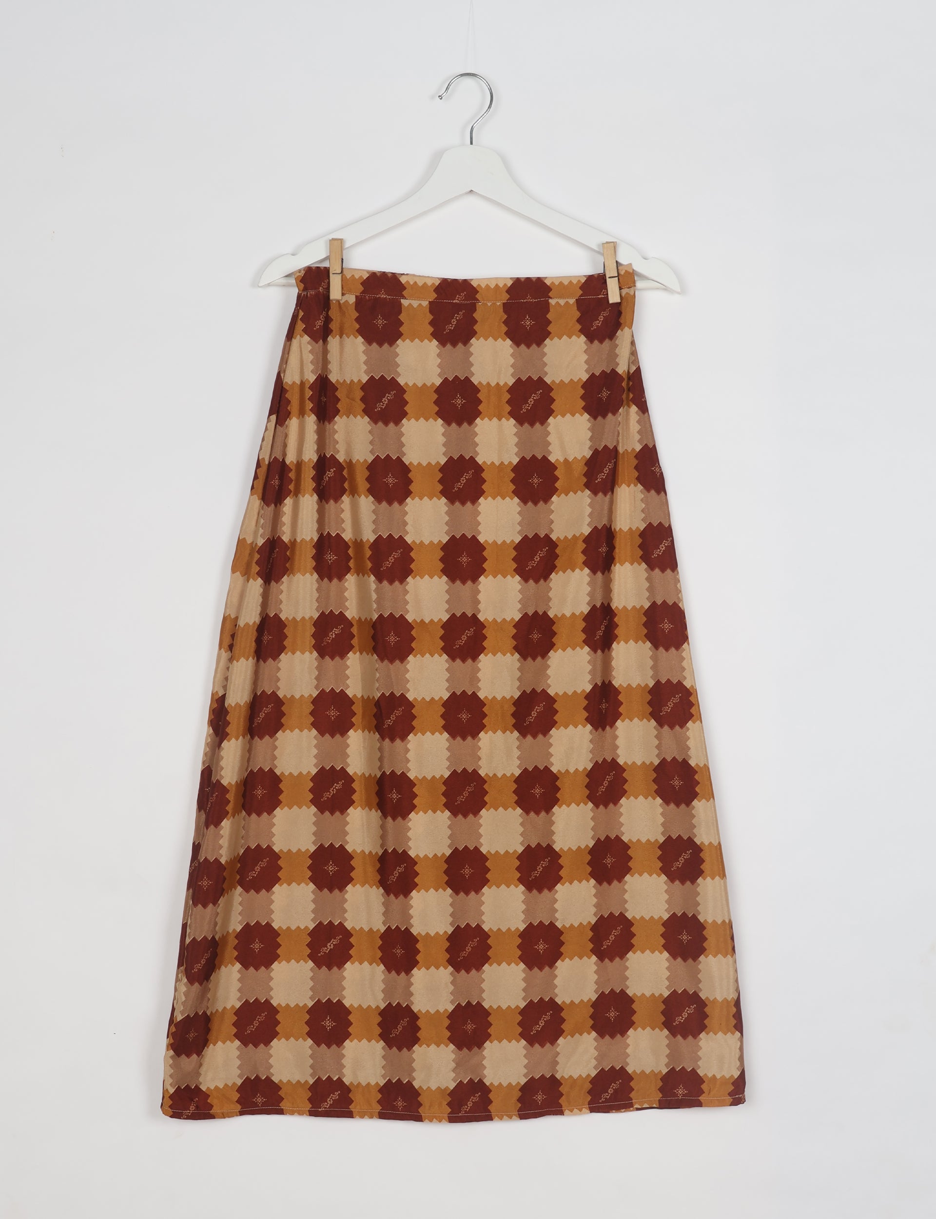 This is a mid-to-ankle length A-line skirt featuring a fitted waistband and flared silhouette. The waistband includes an elasticated back for ease and comfort, while the front remains flat for a clean finish with a button closure.
