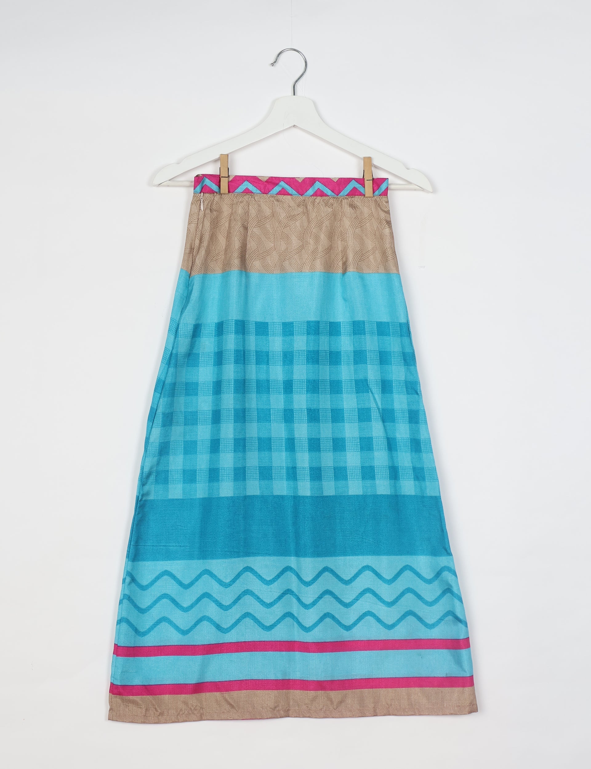 I'm not made from virgin fabrics and dyes, so my carbon footprint, pollution and water usage is way lower than other products. Instead, I'm made with circular production methods, from waste fabric which already existed. I turned into an I was a Sari instead of becoming landfill. Now I'm looking forward to my second life, maybe with you.