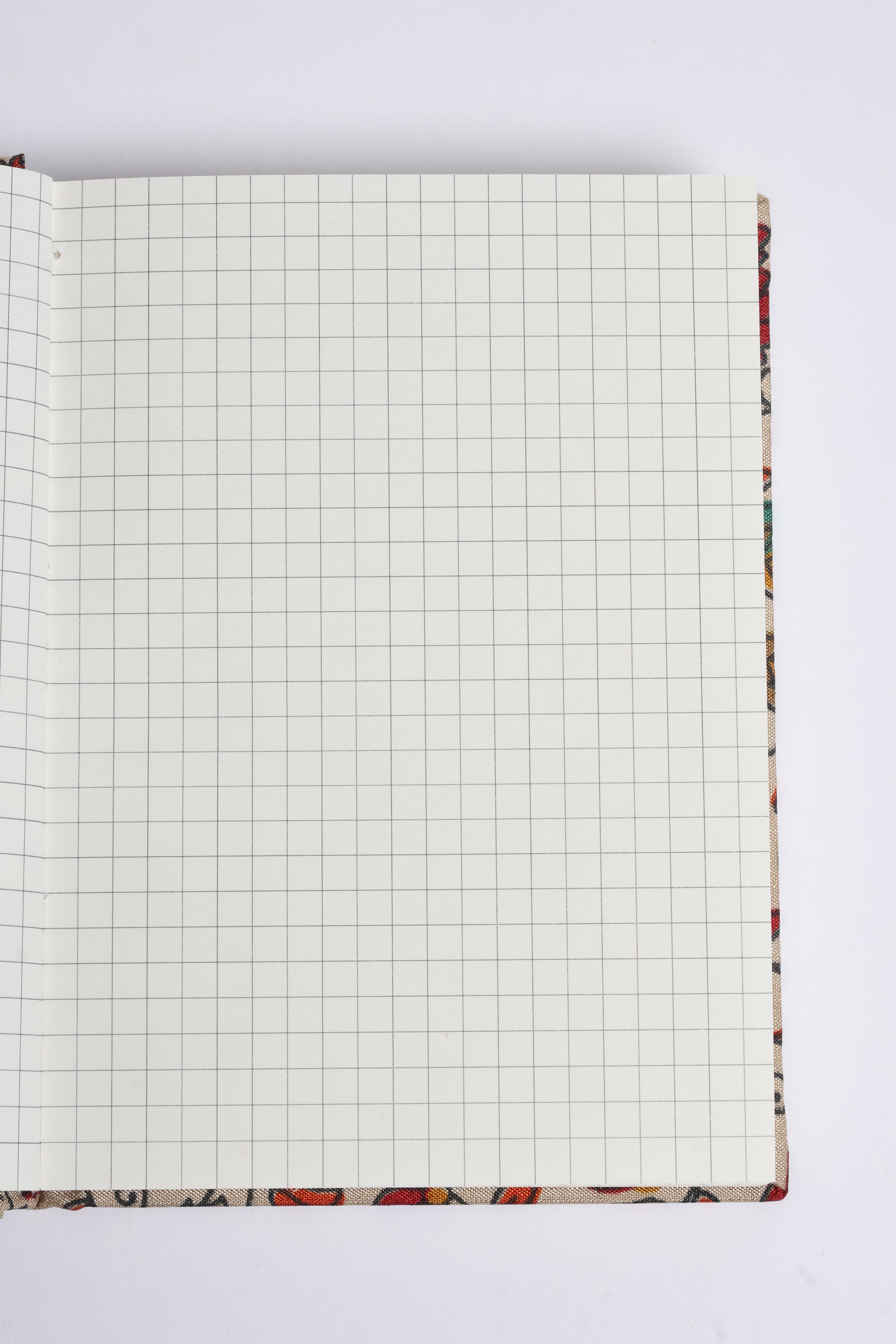 This A6 notebook is covered with pre-loved saris and made with 100% recycled paper with a square grid, it gently reminds you to be kind. Lighting and screens may cause slight variations in color appearance.