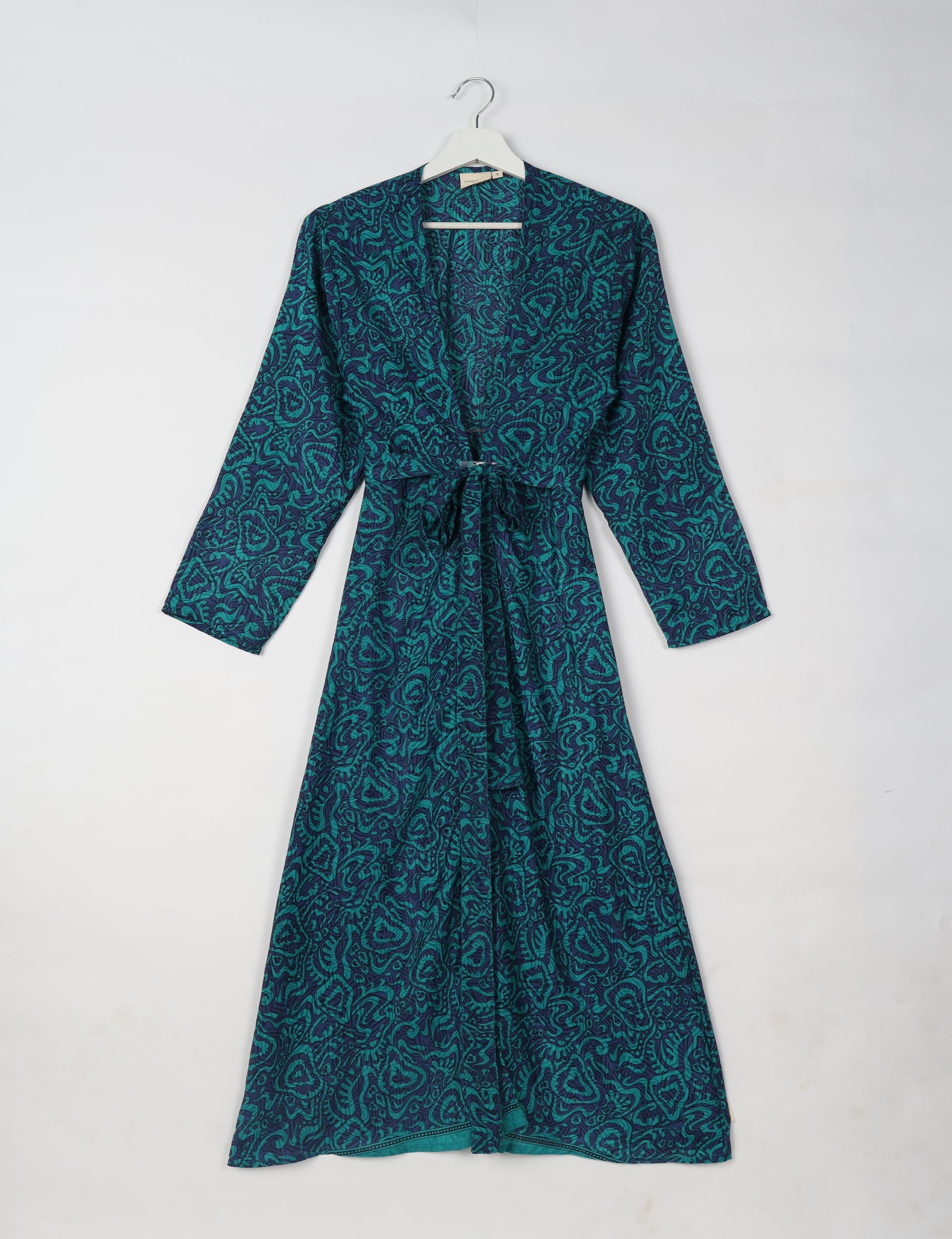 Full-length robe with a tie-up belt. Designed with long sleeves and a straight hem.