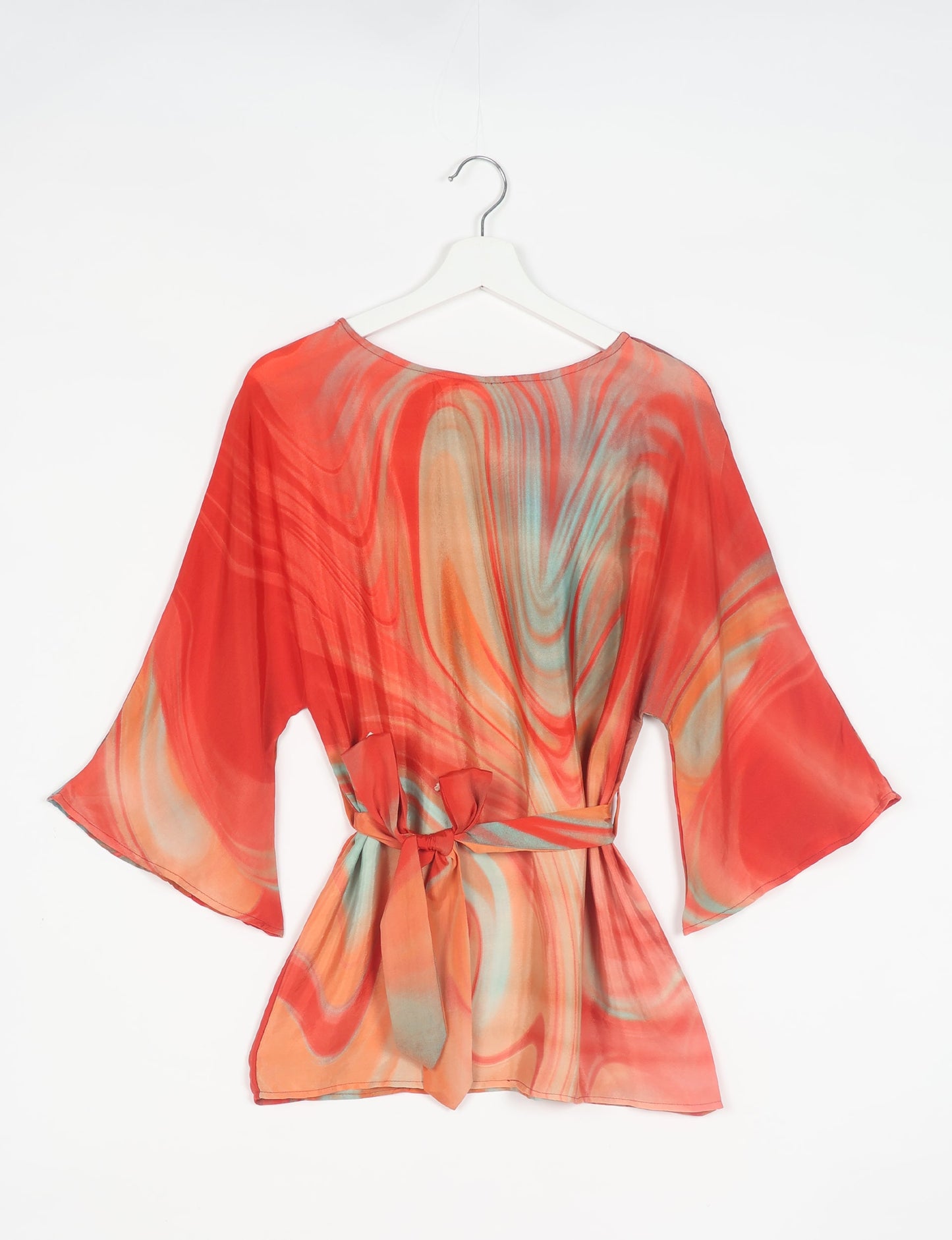 A belted top with a soft, fluid drape. It features a round neckline and wide, 3/4 length sleeves for ease of movement. The fit is relaxed, with a self-fabric tie at the waist that allows for adjustable shaping. Belt loops are positioned at the side seams to hold the detachable tie in place.