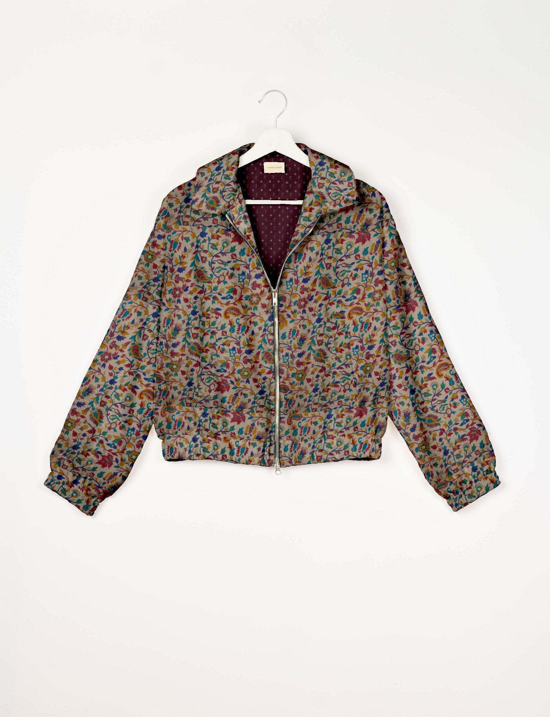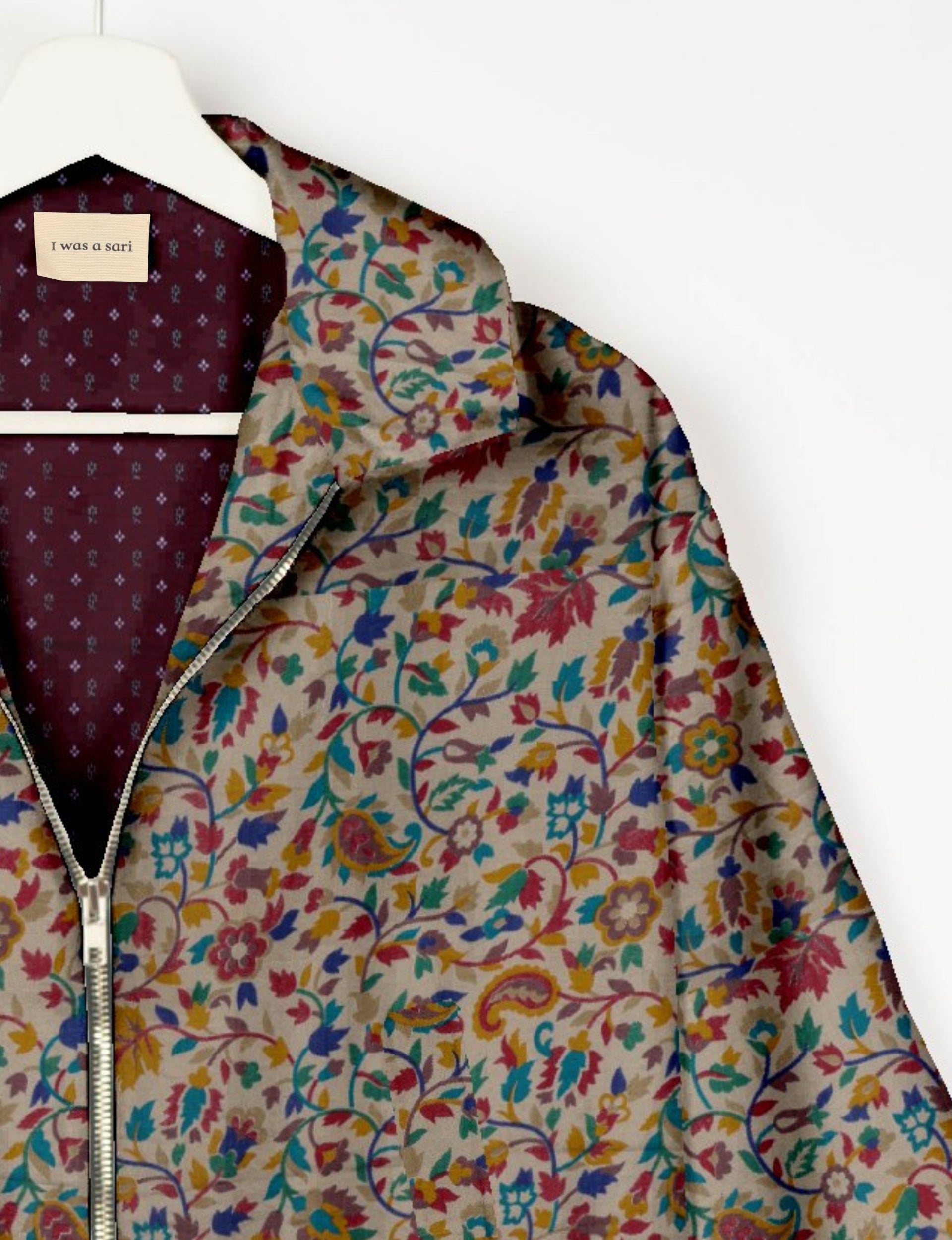 Our Bomber jacket is an iconic wardrobe essential! This military classic features a cropped shape, with elasticated bottom, hem and cuffs. It comes with 2 welt pockets and twin metallic zippers down the front. Also comes with contrast sari print lining and collar flip. Perfect layer for spring days, cool evenings, or air-conditioned workspaces without weighing you down.