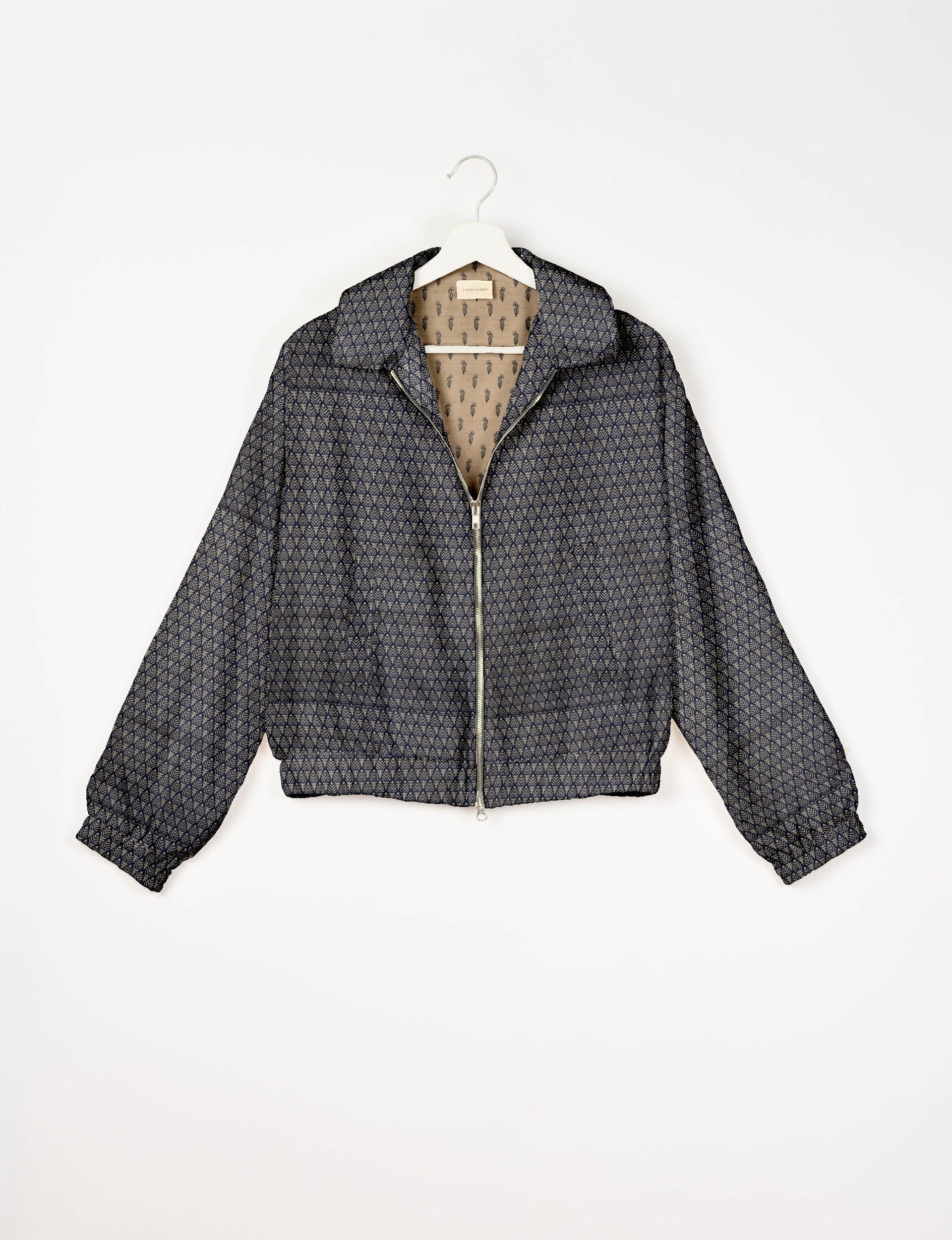 Our Bomber jacket is an iconic wardrobe essential! This military classic features a cropped shape, with elasticated bottom, hem and cuffs. It comes with 2 welt pockets and twin metallic zippers down the front. Also comes with contrast sari print lining and collar flip. Perfect layer for spring days, cool evenings, or air-conditioned workspaces without weighing you down.