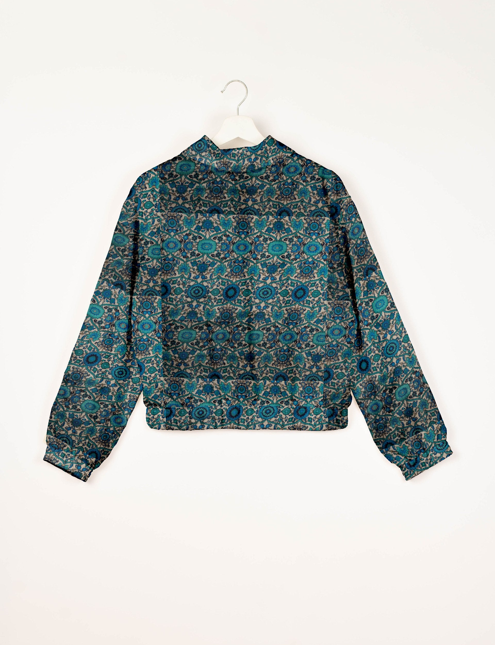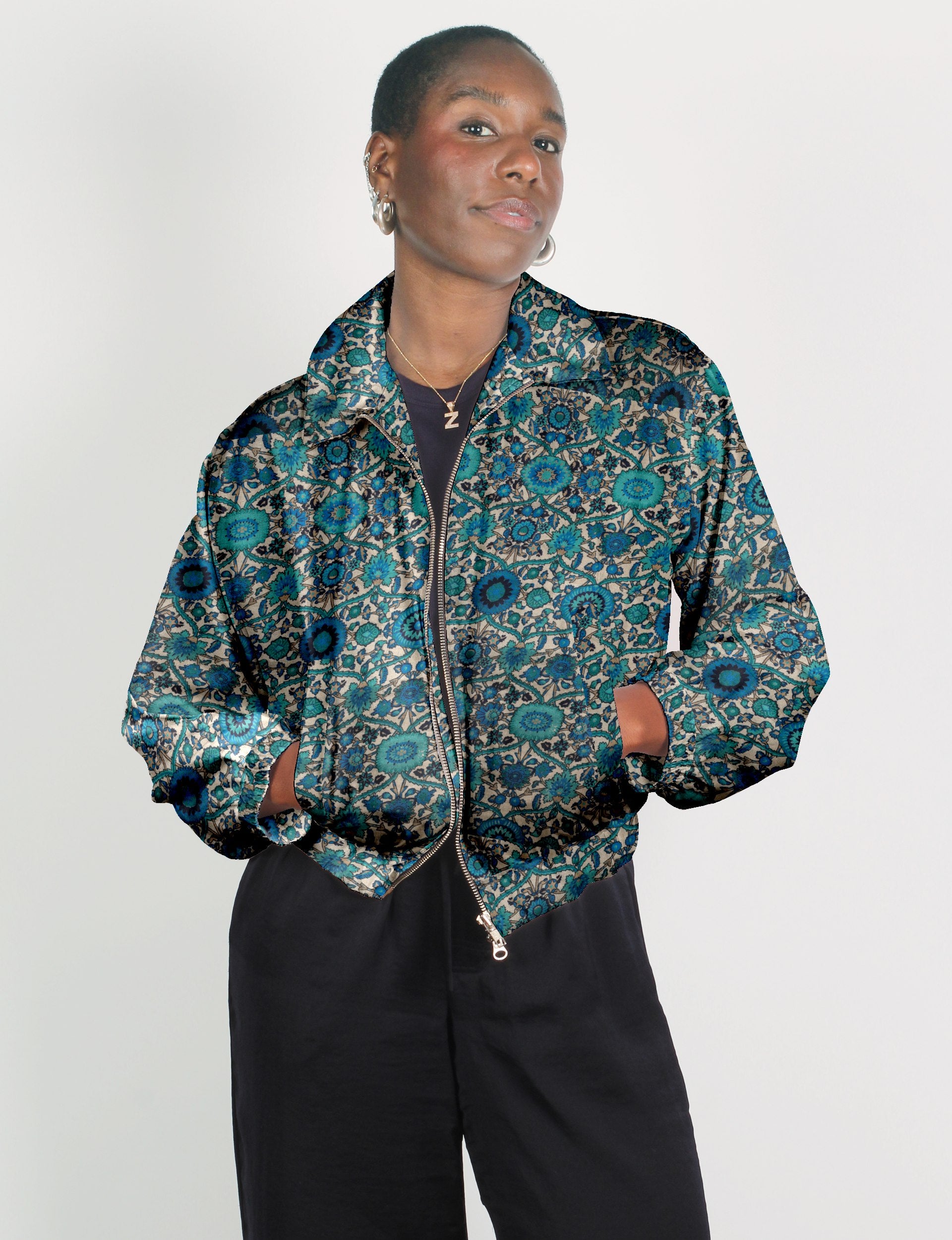 Our Bomber jacket is an iconic wardrobe essential! This military classic features a cropped shape, with elasticated bottom, hem and cuffs. It comes with 2 welt pockets and twin metallic zippers down the front. Also comes with contrast sari print lining and collar flip. Perfect layer for spring days, cool evenings, or air-conditioned workspaces without weighing you down.