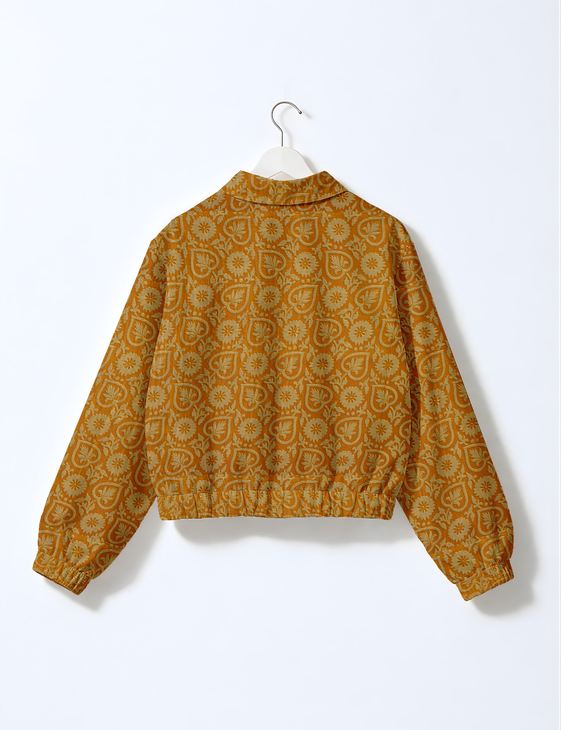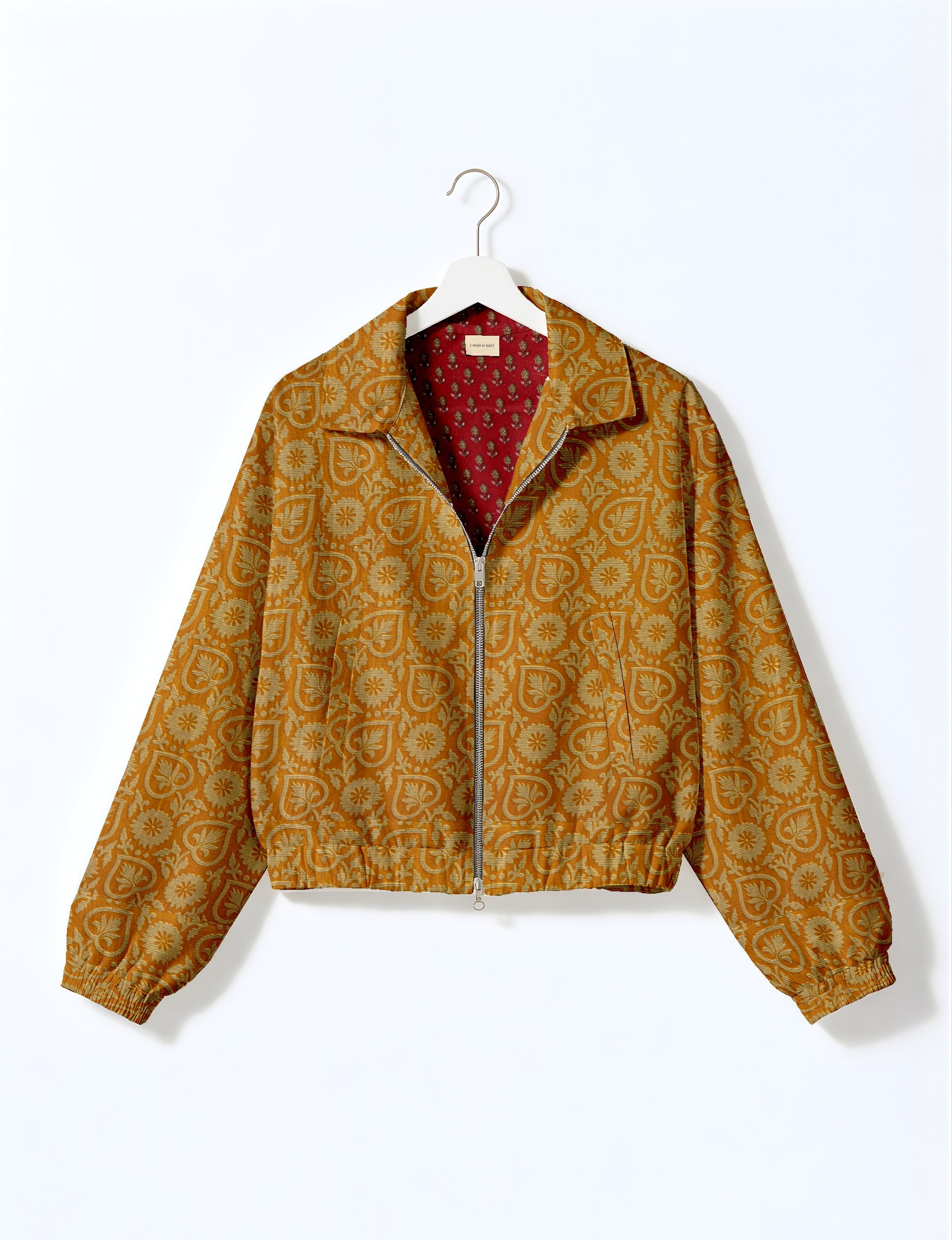 Features a cropped shape, with elasticated bottom, hem and cuffs. It comes with 2 welt pockets and twin metallic zippers down the front. Also comes with contrast sari print lining and collar flip. Perfect layer for spring days, cool evenings, or air-conditioned workspaces without weighing you down.