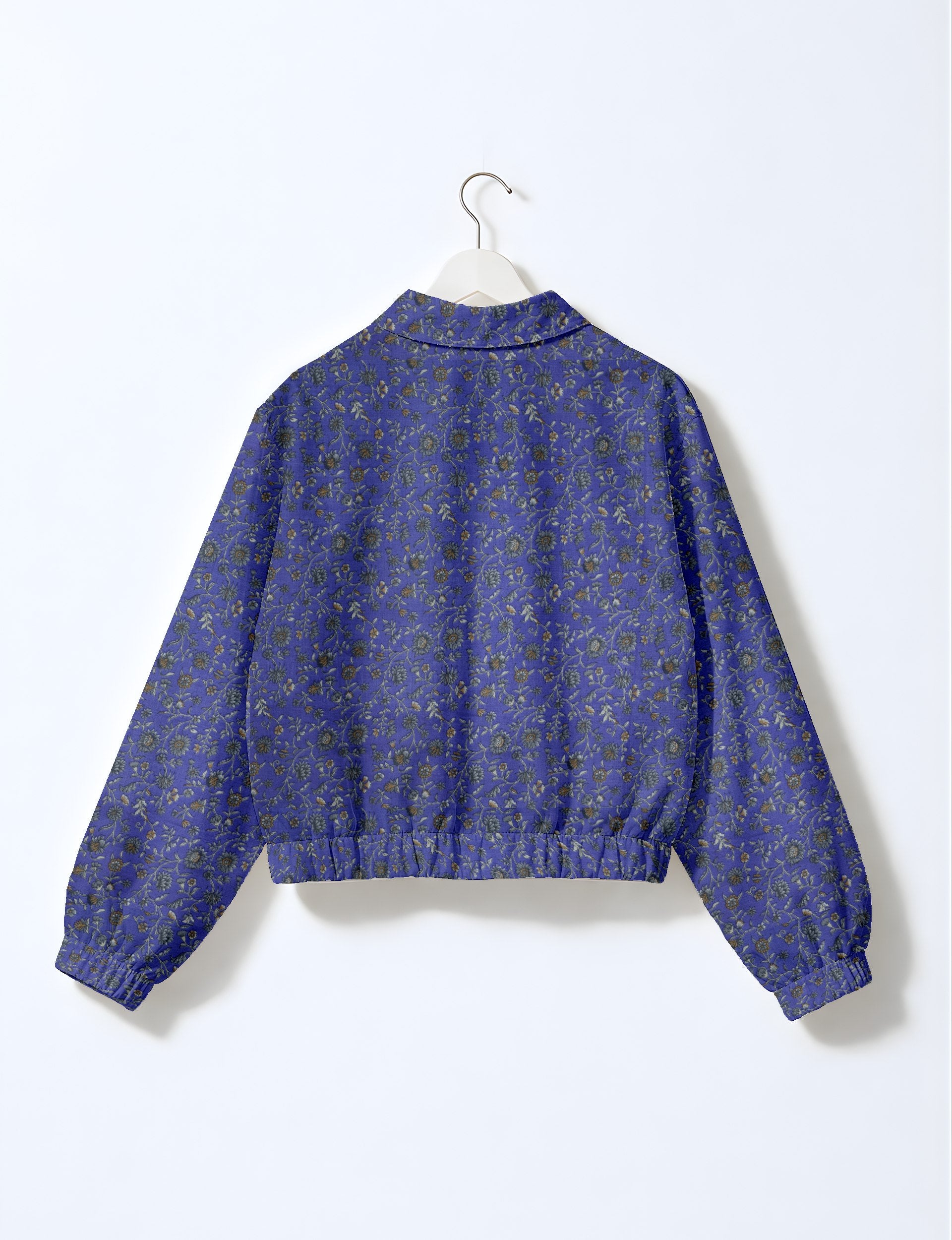 Features a cropped shape, with elasticated bottom, hem and cuffs. It comes with 2 welt pockets and twin metallic zippers down the front. Also comes with contrast sari print lining and collar flip. Perfect layer for spring days, cool evenings, or air-conditioned workspaces without weighing you down.